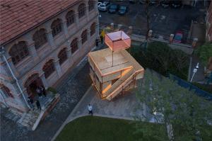 A two-story "street art gallery" was built on the lawn of the large landscape ladder with scaffolding and oriented strand board, with an art scale of 4.8X4.8X2.4, with a ladder leading to the roof platform, and a transparent box above the platform. "Kong Ming Lantern".