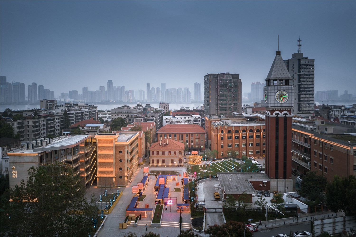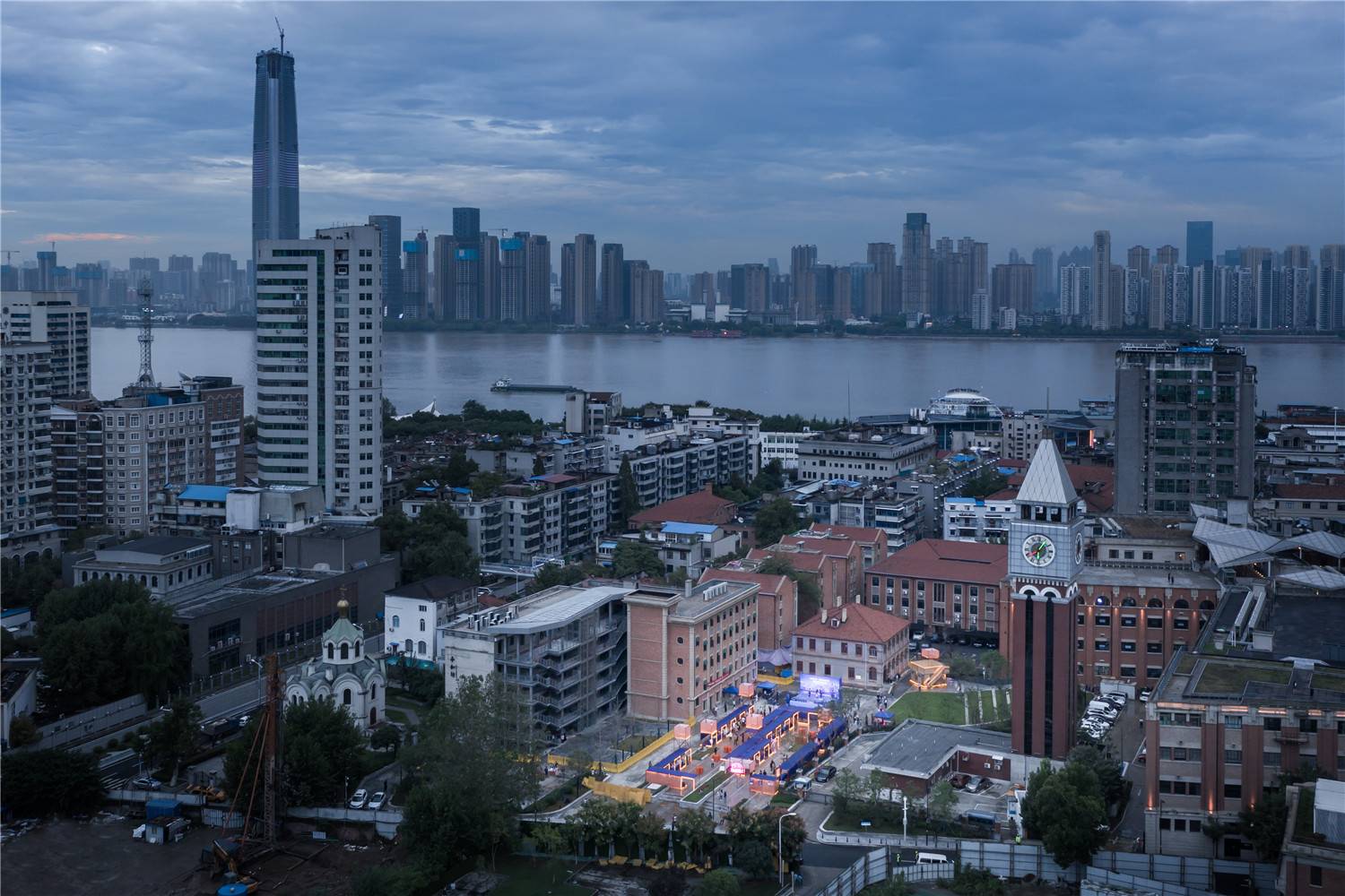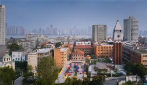 這是一個絕佳的場地,歷史建筑扎堆:場地南側是有115年歷史的平和打包廠舊址;北側是127年歷史的東正教堂;東側是107年歷史的魯茲故居;中心廣場正下方是長江第一條過江公路隧道,廣場南側聳立的古典式鐘塔其實是長江隧道的通風豎井。