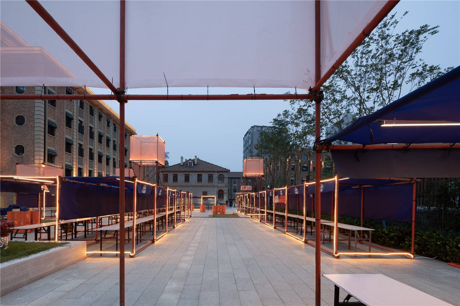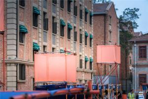 Scaffolding is cheap to rent and easy to build. Three skilled workers on site completed all the structures in eight hours; we designed 2X2X2 meter unit modules as each shop unit; there are 4 meters and 6 meters high towers locally, using Translucent grid cloth form eye-catching floating boxes at high altitudes, which are vividly called "Kongming lanterns" by the workers. What I care about is the floating feeling brought by its transparent texture, just like the floating red box designed by UAO in the Hongfang ADC showroom.