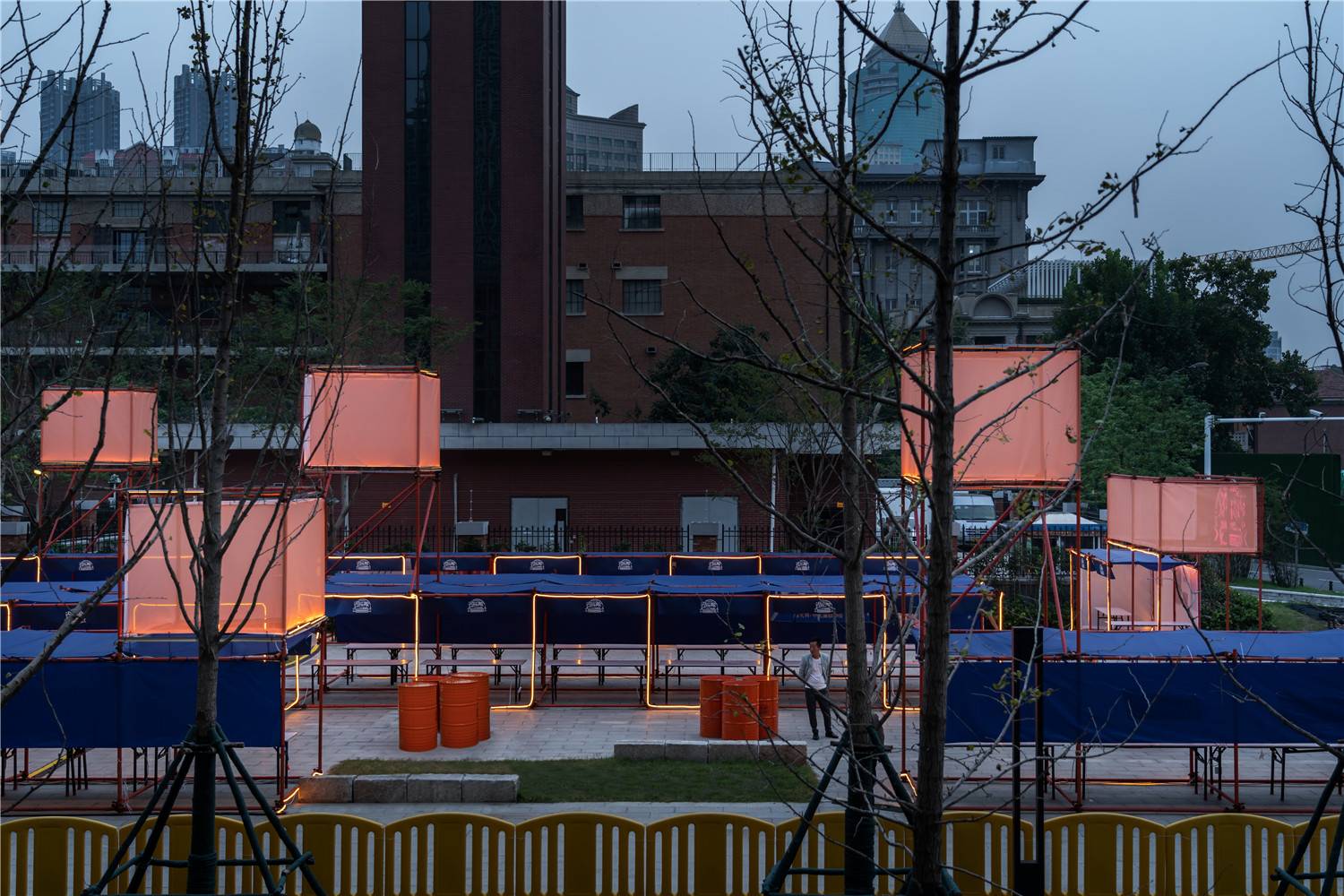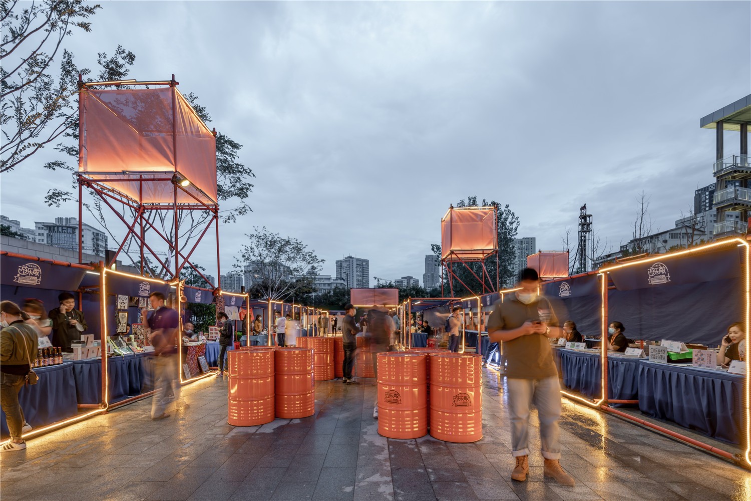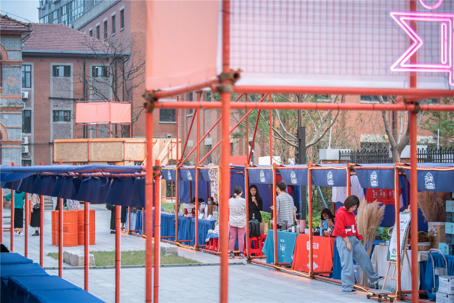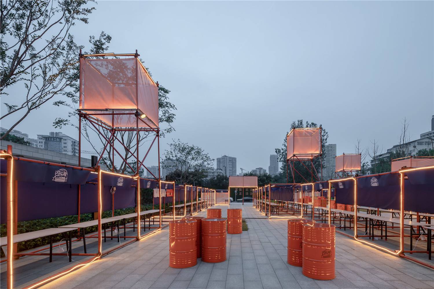 The rain tarpaulin is made of blue, and the top "kongming lantern" and the scaffolding steel pipe spray paint are orange. The two contrasting colors have a strong visual appeal; and the theme neon light is pink to highlight the LOGO.