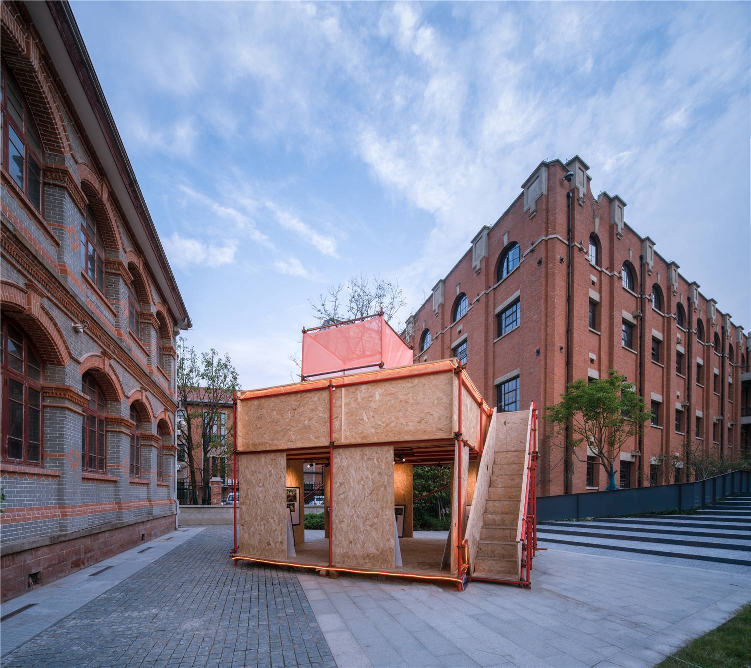 在景觀大階梯草坪邊,用腳手架和歐松板,搭建了一個兩層的“街頭美術館”,美術尺度4.8X4.8X2.4,用一個階梯引導到屋頂平臺,平臺上方也有一個透明盒子的“孔明燈”。