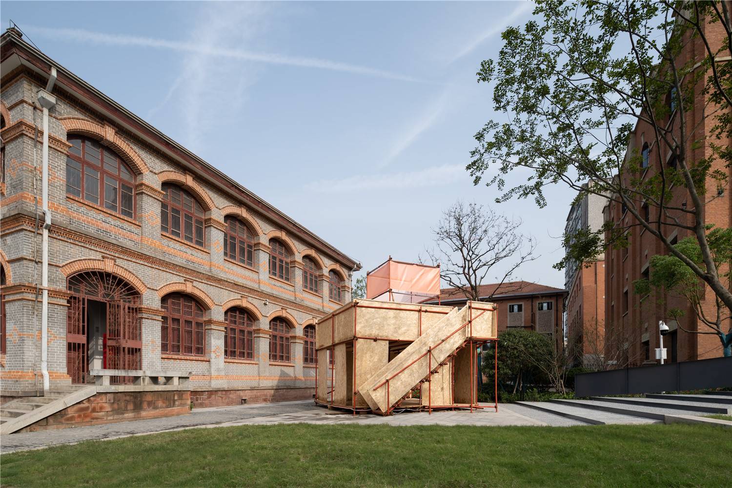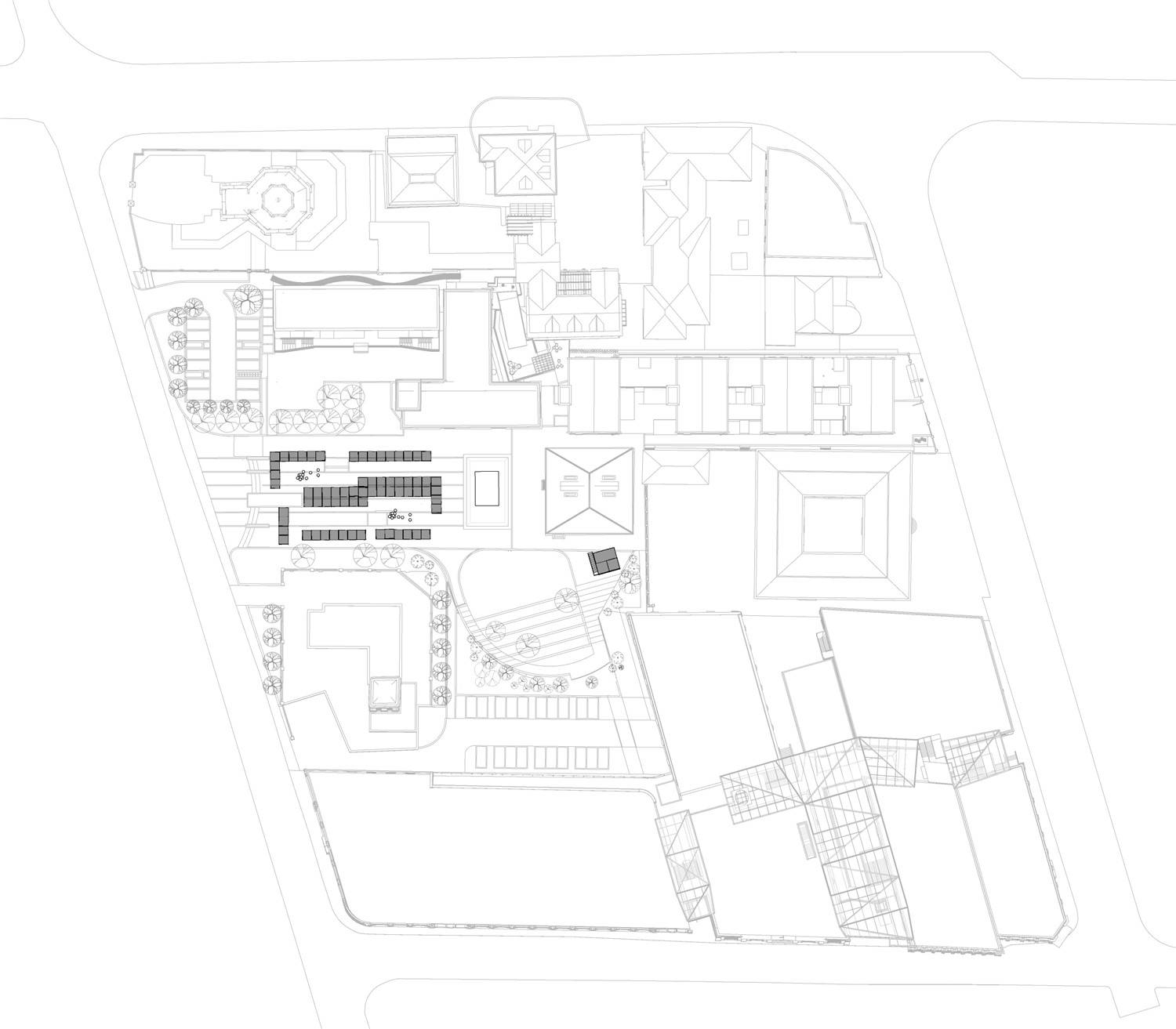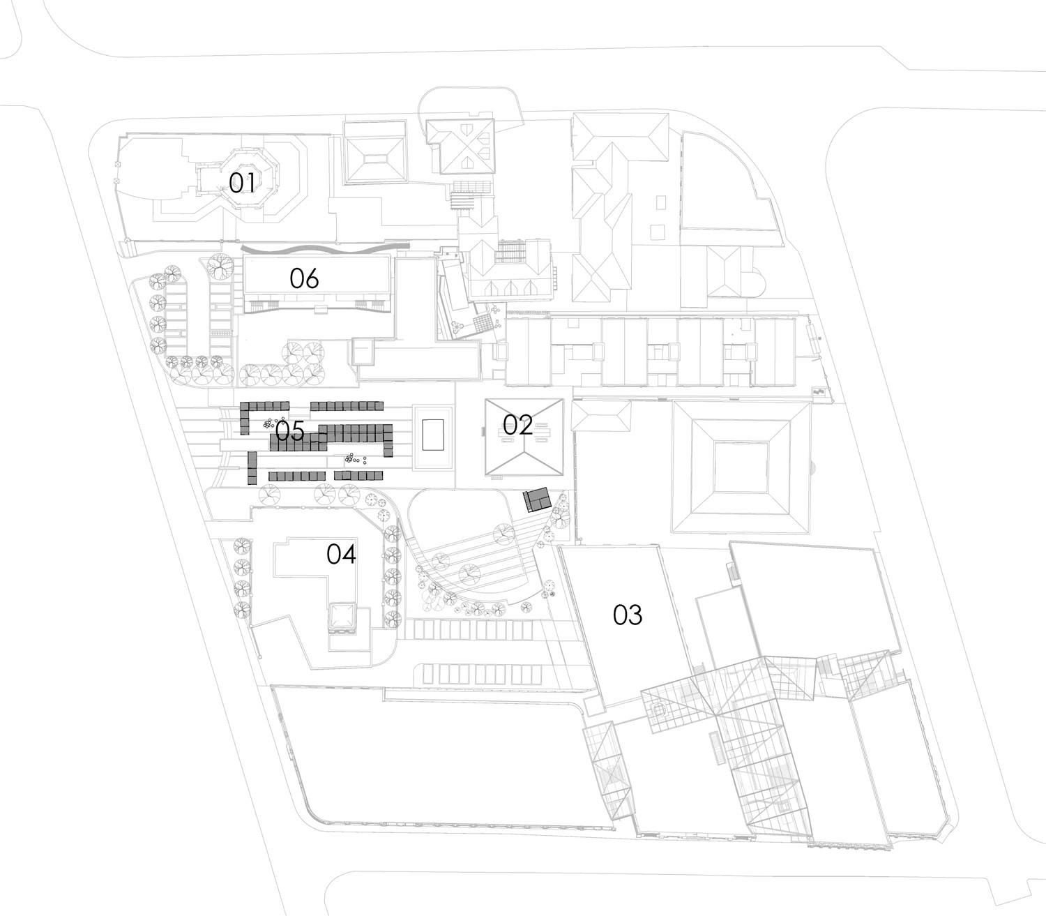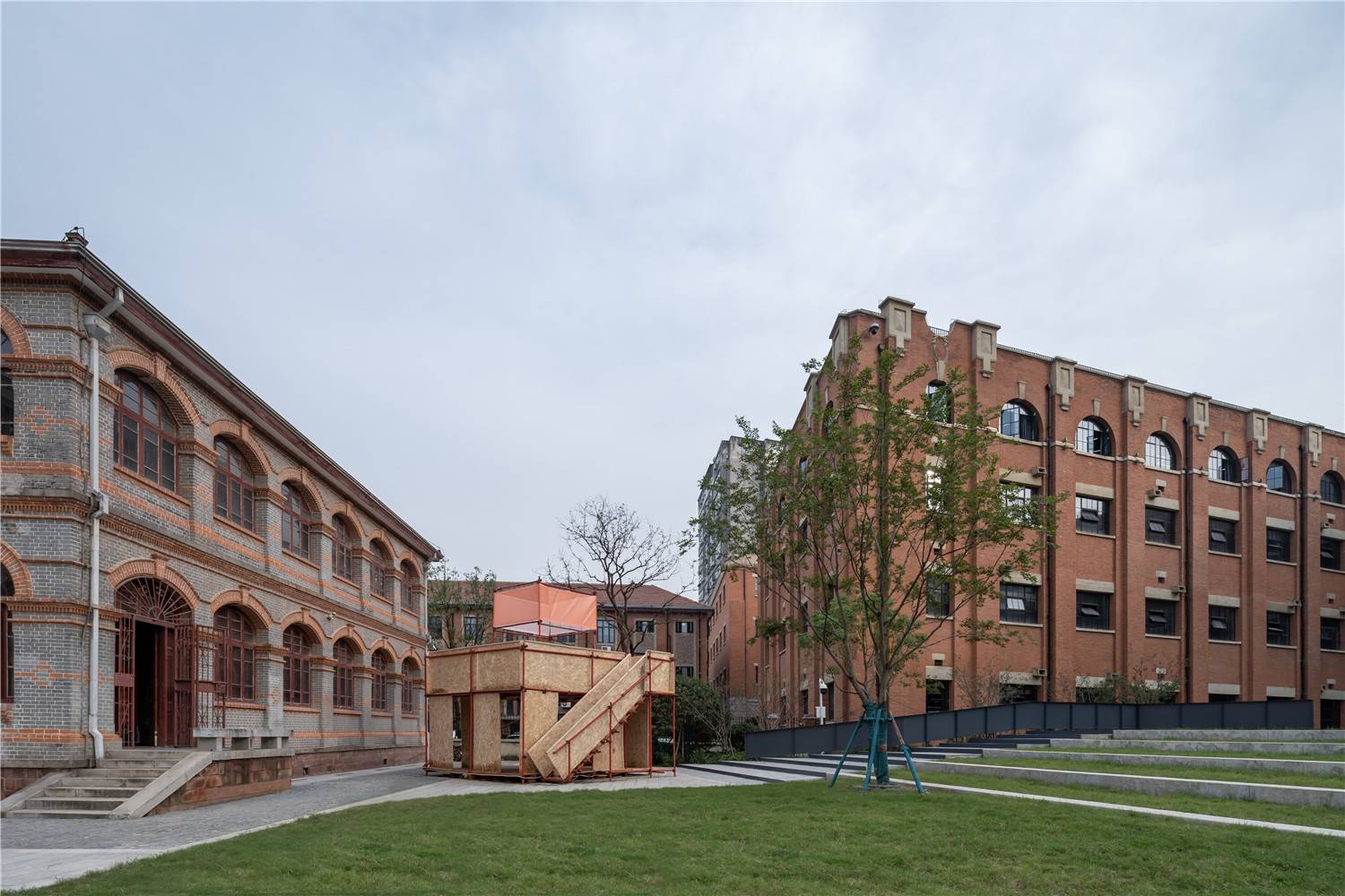 The relatively new buildings on this site have been demolished during the construction of the tunnel in 2004-2008, and new buildings directly above the tunnel are no longer allowed; as an above-ground supporting space for urban transportation facilities, it is passive and closed, and not frequently used by the public; our initial landscape design plan was to create a central square with enclosed corridors, hoping to connect different buildings of different ages on the site through the corridors, and use the corridors to create stays; this landscape plan eventually was not realized, only the central hard plaza was retained, and different design strategies were adopted to create a small environment in different surrounding areas, such as stepped green spaces. The empty square in the center reserved the possibility for the multi-functional use of the composite space later.