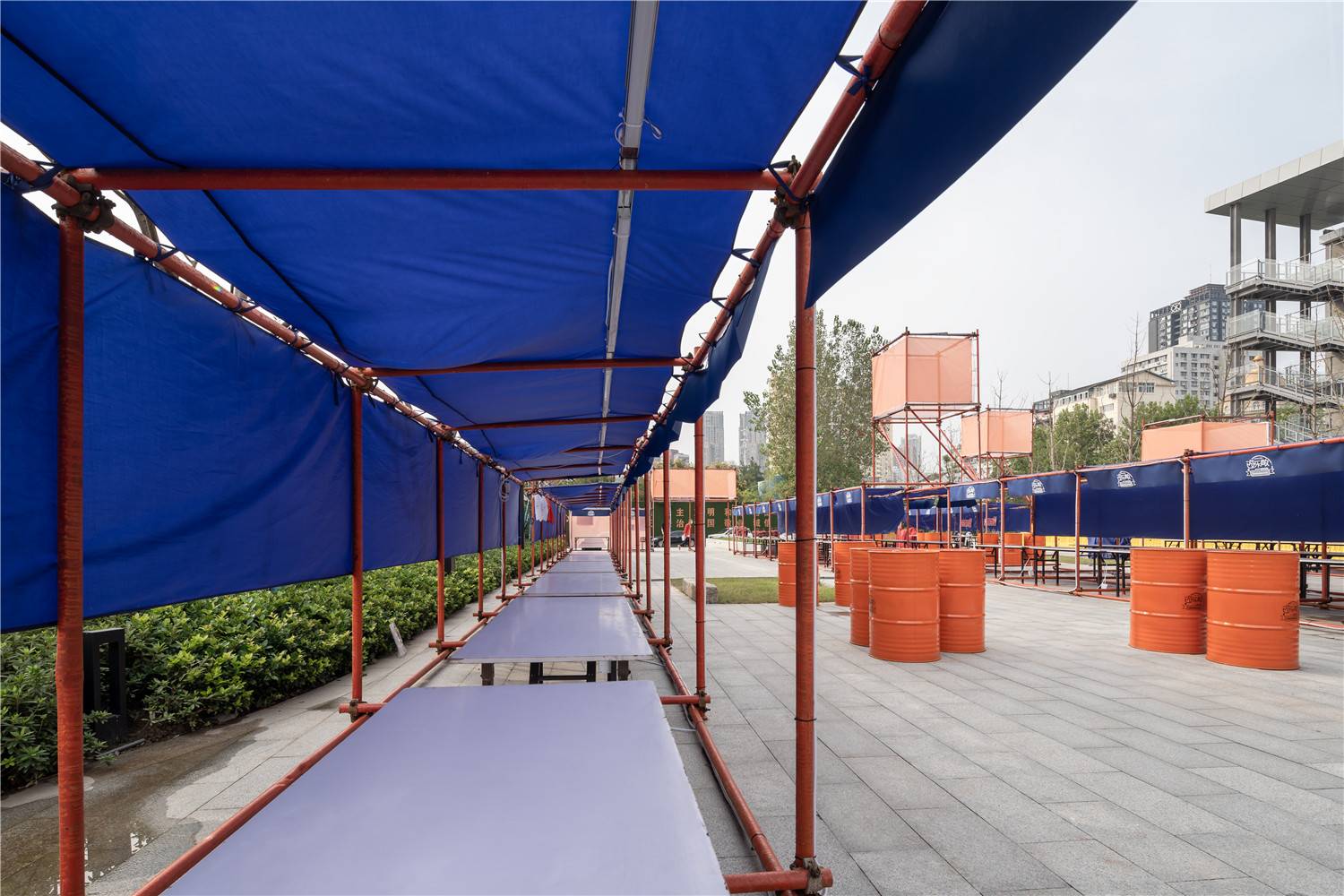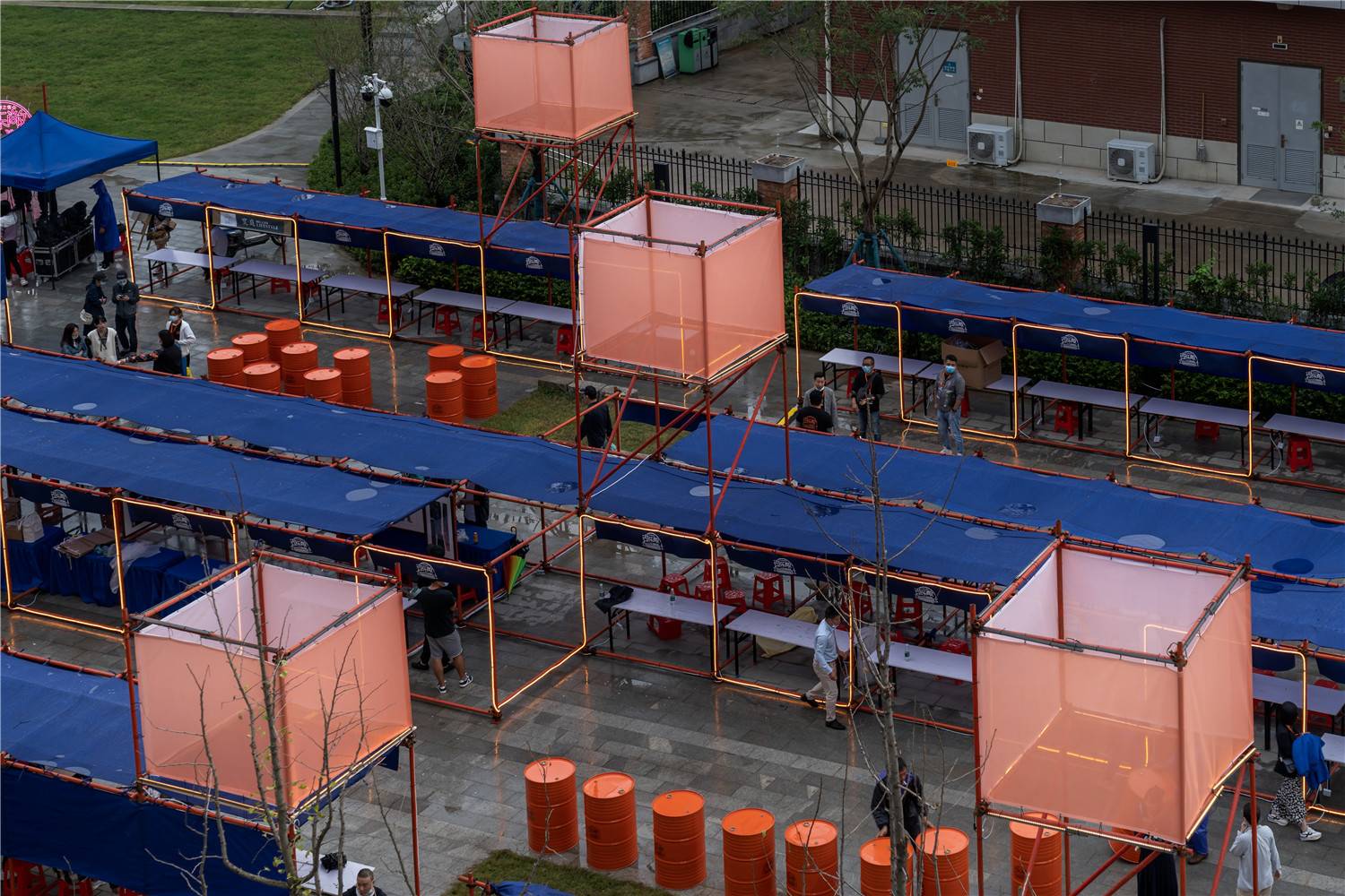 在搭建材料的選擇上,考慮到室外耐久性、以及武漢多雨的現(xiàn)實條件,首先排除了常規(guī)的木結構搭建一個個商位的做法; “游樂敞2020”市集延續(xù)時間比一般市集相對較長,從9月19號開幕,一直到10月1日國慶節(jié)的三個周末,所以它必須穩(wěn)固,防盜,防雨;中間不開市集的工作日,不需要搬來搬去收到倉庫里去。而三周之后,搭建的市集就被解散,考慮到這種“臨時性”,我決定用腳手架這種工地材料來實現(xiàn)市集的搭建。