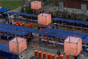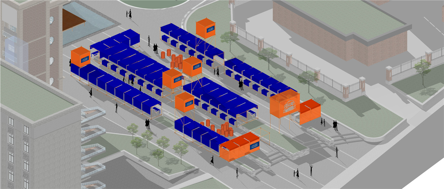 In the selection of construction materials, taking into account the outdoor durability and the rainy conditions in Wuhan, the practice of building individual shops with conventional wooden structures was first ruled out; the "Yolechang2020" market lasts relatively longer than ordinary markets , From the opening on September 19 to the three weekends of the National Day on October 1, so it must be stable, anti-theft, and rain-proof; and no need to move around on working days when there is no market in the middle. After three weeks, the market was disbanded. Considering this "temporary nature", I decided to use scaffolding as a construction site material to build the market.