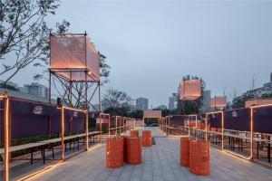 雨篷布采用藍色,頂部的“孔明燈”和腳手架鋼管噴漆則是橙色,兩種對比色系具有強烈的視覺吸引力;而主題霓虹燈則采用粉色,以突出LOGO.