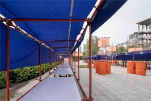 考慮到實際搭建的方便,減少加工次數(shù),在搭建過程中,將原本各單元內單獨的頂部雨篷布,修改整合為整體覆蓋一縱長條的頂部的一條長雨篷布;雨篷布與腳手架鋼管的固定采用同材質布條綁扎的模式,其原因一是方便,二是體現(xiàn)雨篷布這種材質的張力特性。