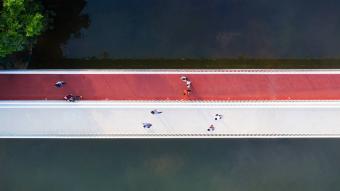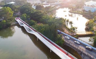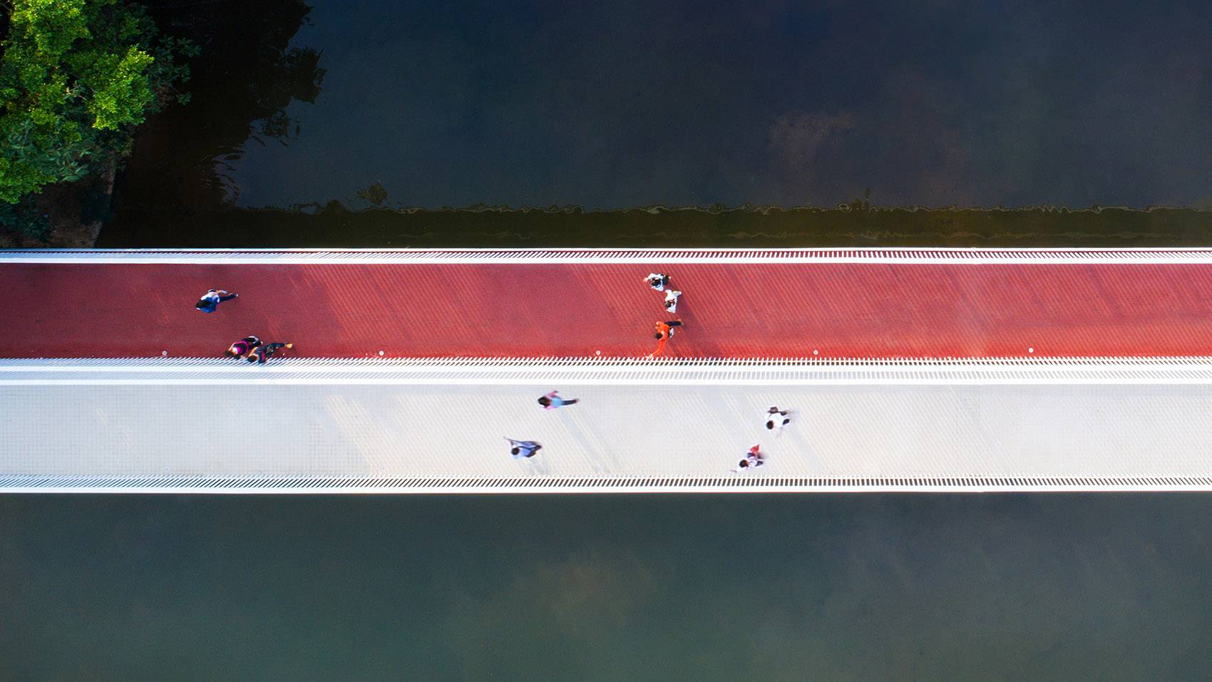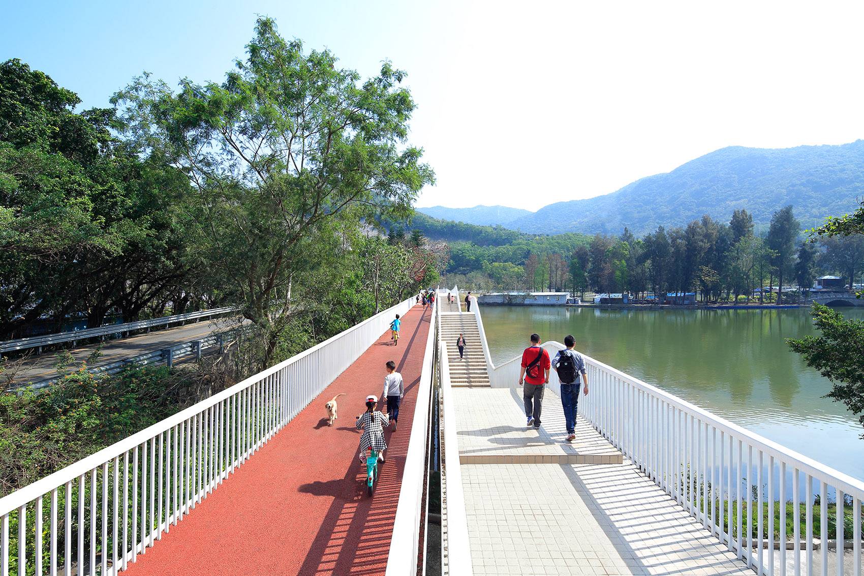 The eight-meters-wide bridge is splatted into two four-meters passages. One is a straight body, which provides flatness. This is a barrier-free passage that can be used by walking, jogging, cycling, wheelchairs, and small strollers. The other one is an undulating leisure trail, which runs from ground level down to lake water level and up to higher level that overlooks the driveway. The streamlined design allows people to slow down, or in other words, gives people a choice to slow down, if they wish to.