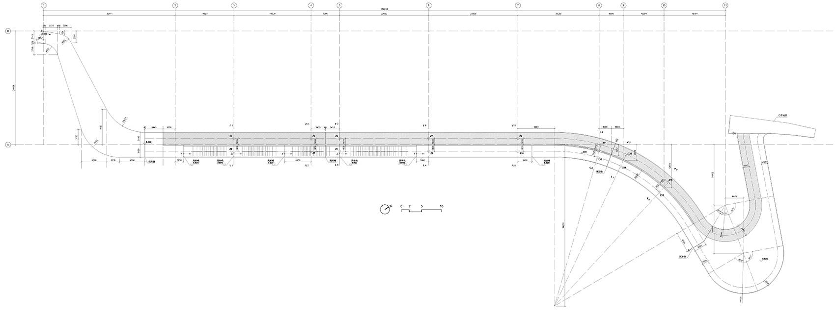 We want simple solutions in construction. In plan, the bridge body is mainly composed of one straight line and one tangent arc, while the elevation is composed of multiple straight lines and multiple tangent arcs. To meet simple implementation during construction period, the design optimized the geometric composition and adjusted the curve distribution to have correspondence between the straight lines of the plane and the curve segment of the elevation, and vice versa, avoiding hyperboloid geometry.