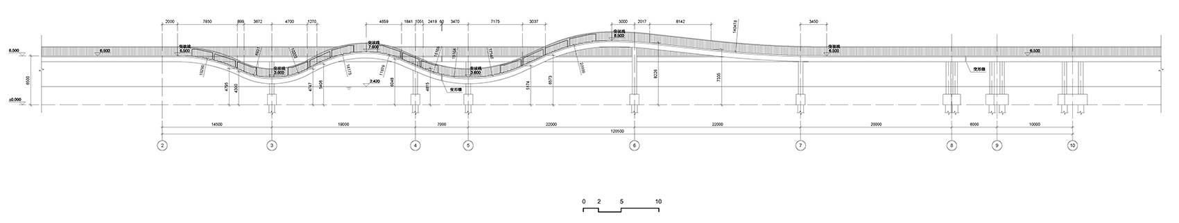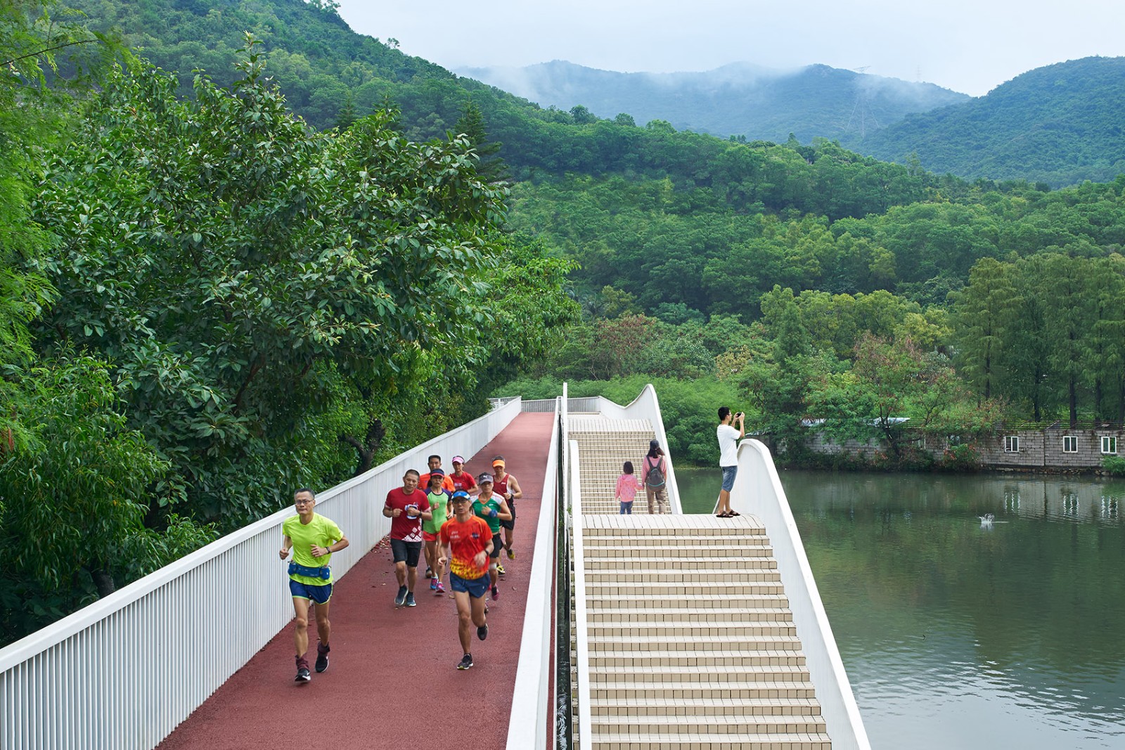 To become a landscape feature, the design looks in to Jade Belt Bridge (famous in Chinese classical gardens) as reference. Straight line reflects water surface, while curved line represents the undulating hills. Two passage of Split Bridge makes a combination of both. Also, the different heights of walking trails create interesting viewpoints for spectators.
