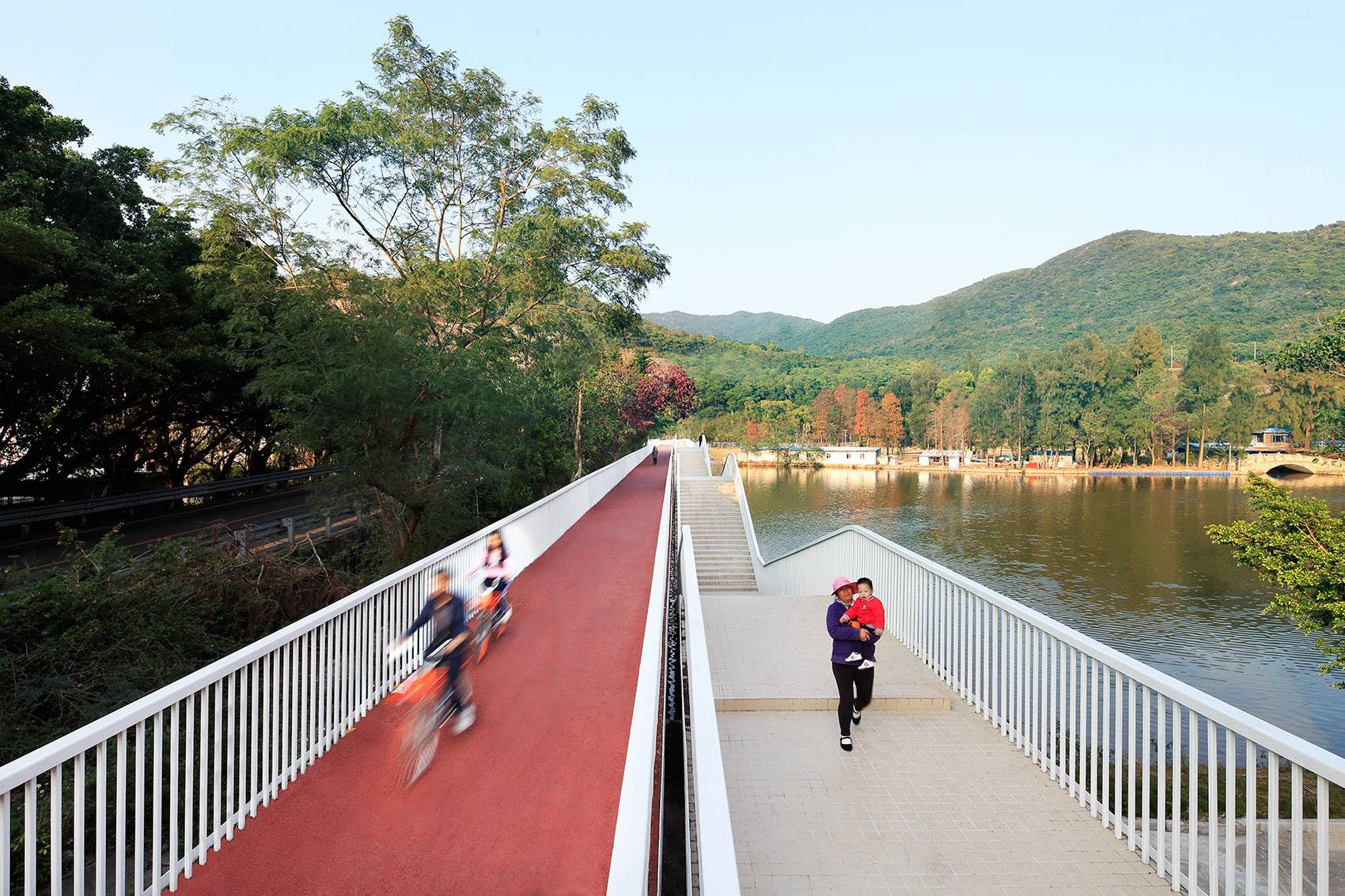 步行橋共計八米寬,一分為二。取四米筆直橋身一躍而過,為過橋的人們提供平坦和便捷,是步行、慢跑、騎行、輪椅、小童車都能使用的無障礙通道。取四米橋身起伏,往下貼到湖面,往上高于馬路,這是一條休閑步道,流線的設計讓人能夠慢下來,或者說,讓人有了慢下來的選擇。