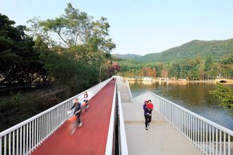 Shenzhen is the fastest-growing city in the world, expanding over 1000 hectares of new construction land each year. Xiaomeisha is located in Dapeng Bay in the east part of the city, surrounded by mountains on three sides and facing the water on one side. It has always been a valuable natural spot for people to escape from urban chaos. Here the Split Bridge is designed for hikers to cross the lake. The idea of splitting the footbridge in to two paths is to open up choices of calm and relax for urbanites.