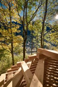 The intervention in the woods acts to counterbalance the current trend of exponential development of technologies that will alter the way humans build their habitat. The selection of native material; larch trees cut on site to deforest the areas on the slopes of the valley involved in the archaeological restoration of the ancient terraces, is the first sign of sensitivity to the environment and uses the material to the best of its evocative power. The purity of design thinking and the almost absence of particular construction techniques remind us of a work that does not need to declare a temporal condition to emphasize the centrality of the relationship between man and nature.