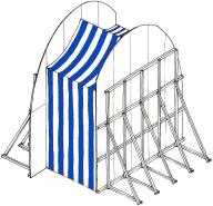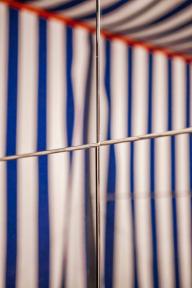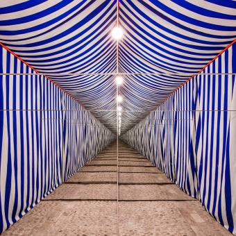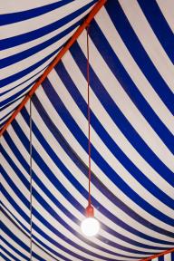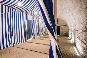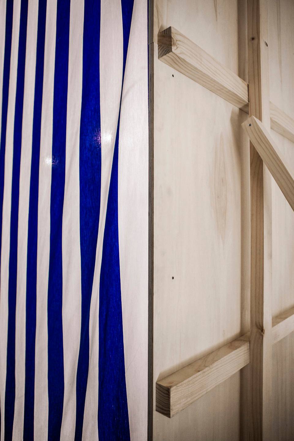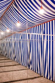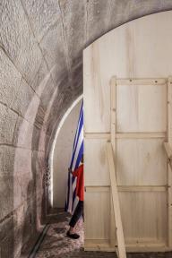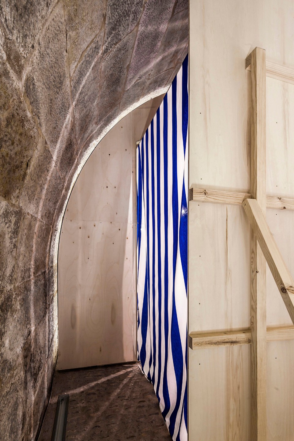 Up close, it is discovered that the wooden wall allows a passage through, as it moves to one side to allow for a crossing to the other. Therein lies a curtain to be drawn in order to enter, and all of a sudden, a complete change of space…the ashlars, the stone and the vault… the cellar becomes something else entirely; a light, festive, ephemeral and tectonic space. Once can traverse this new space and upon exit confirm that the cellar remains as it was, immutable and stonelike, though the mind retains the altered space just crossed.