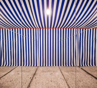 走進(jìn)就會(huì)發(fā)現(xiàn)木墻旁邊有通道可以穿到另一邊,拉開(kāi)帷幕,空間瞬間發(fā)生變化,木墻、石頭、筒拱全都不復(fù)存在,地窖完全變了模樣,變成明亮的、歡快的、瞬息萬(wàn)變的構(gòu)造性空間。穿過(guò)這個(gè)空間,地窖又恢復(fù)原樣,剛剛的空間卻保留在大腦中。