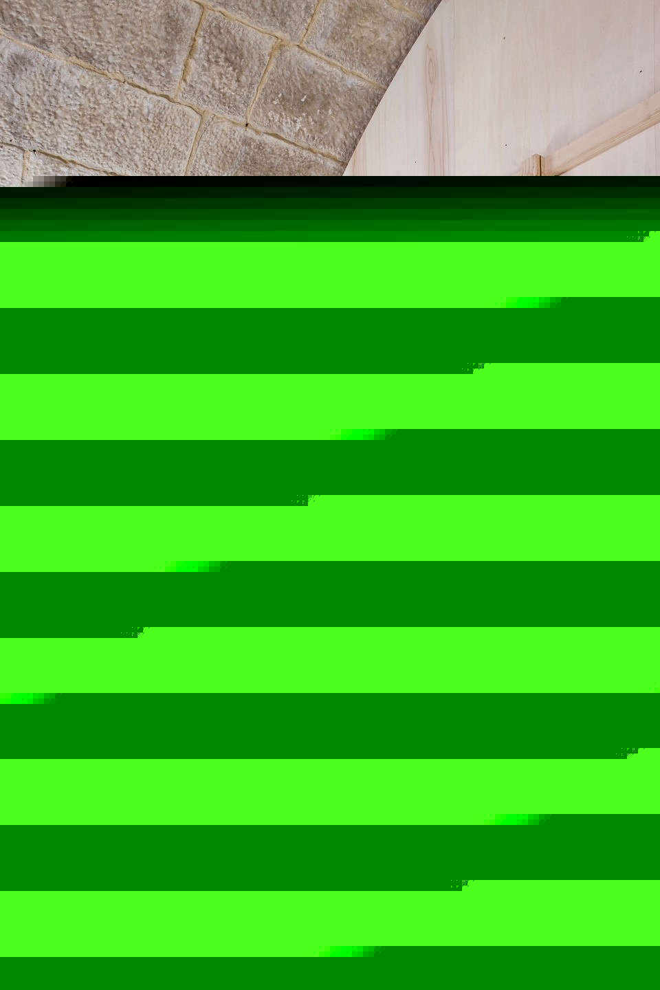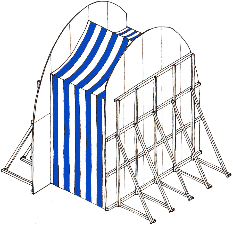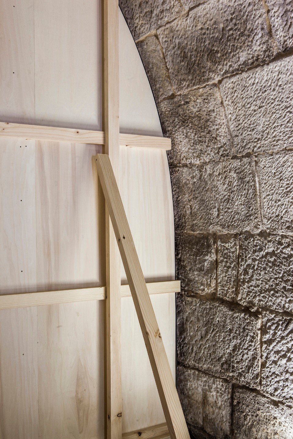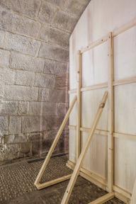 Clearly, it is an external element; the fact that it is made as a plywood scaffolding reveals that it is somewhat unstable, and probably, temporary. It appears light and removable, both due to its shape and the materials of its construction, while on the other hand it presents the same shape as the space it occupies, which is in contrast stonelike, heavy and stable.