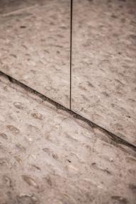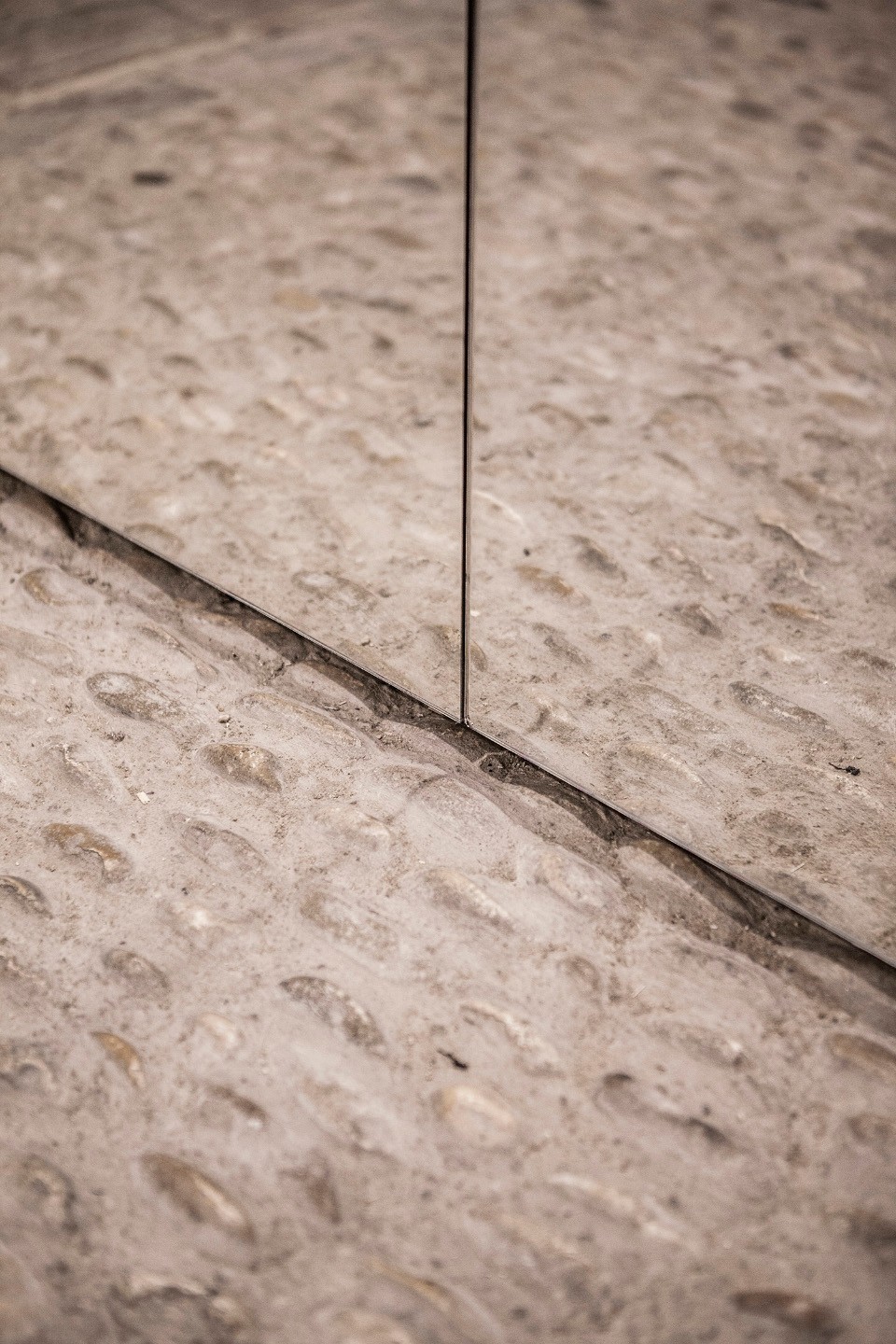 事實(shí)上它是由腳手架支撐的膠合板,并且只是裝置的外部元素,具有不穩(wěn)固性和臨時(shí)性。它的形狀與所處空間相同,材質(zhì)看起來(lái)很輕且可移動(dòng),而其所處的空間由石頭構(gòu)成,呈現(xiàn)出與之相反的沉重感和穩(wěn)定性。