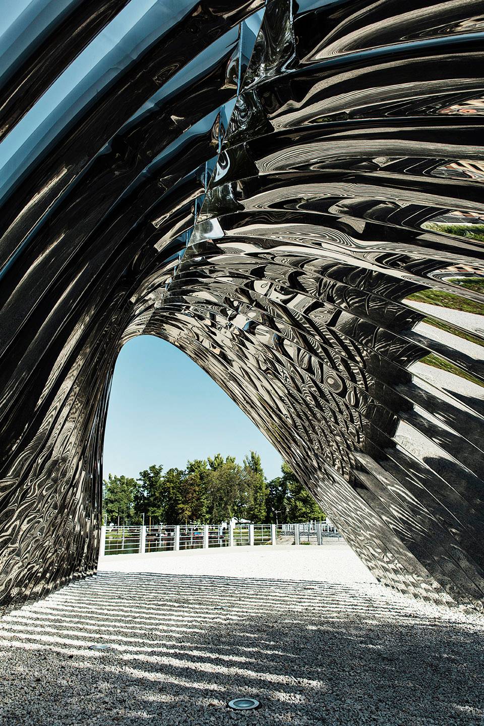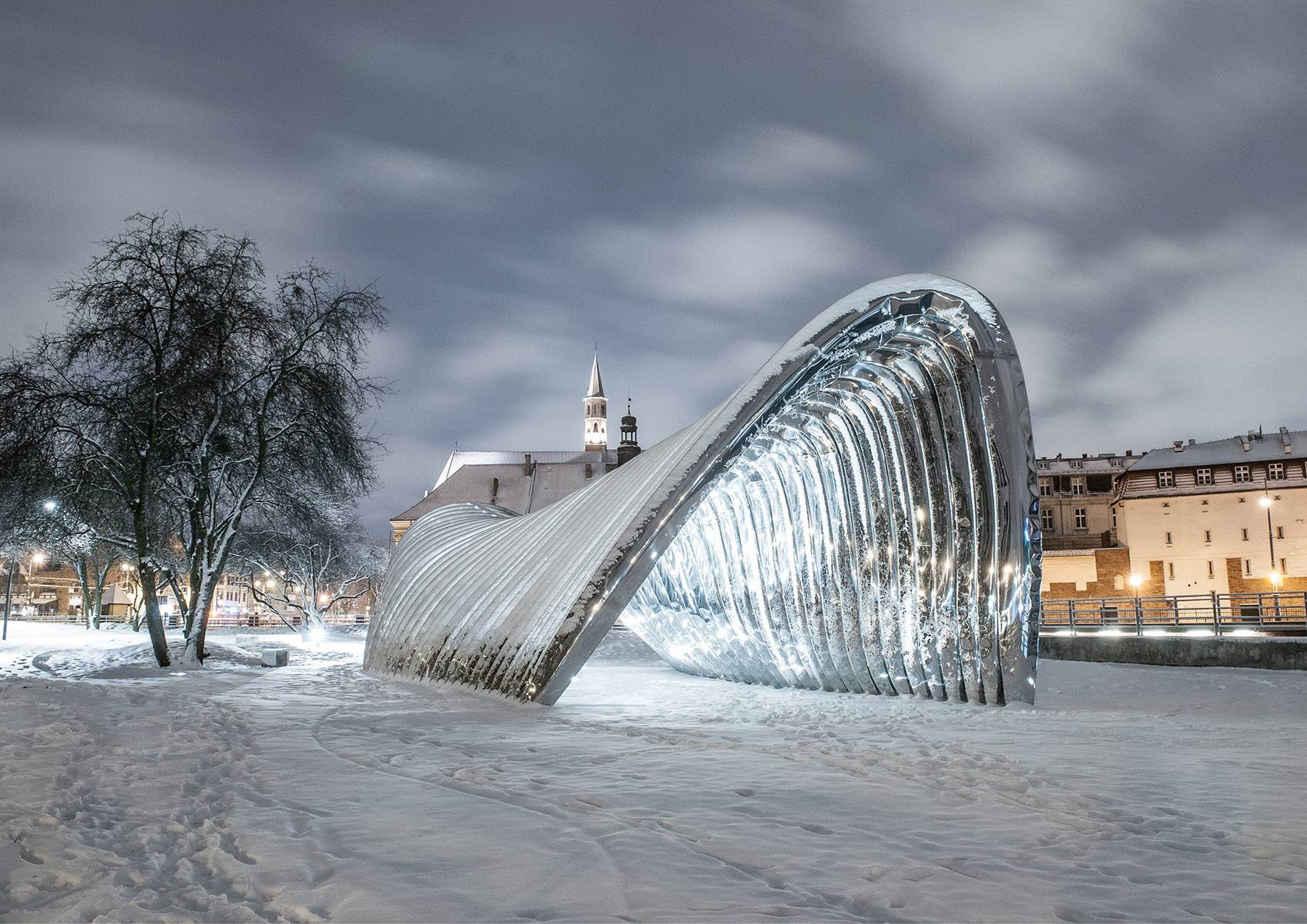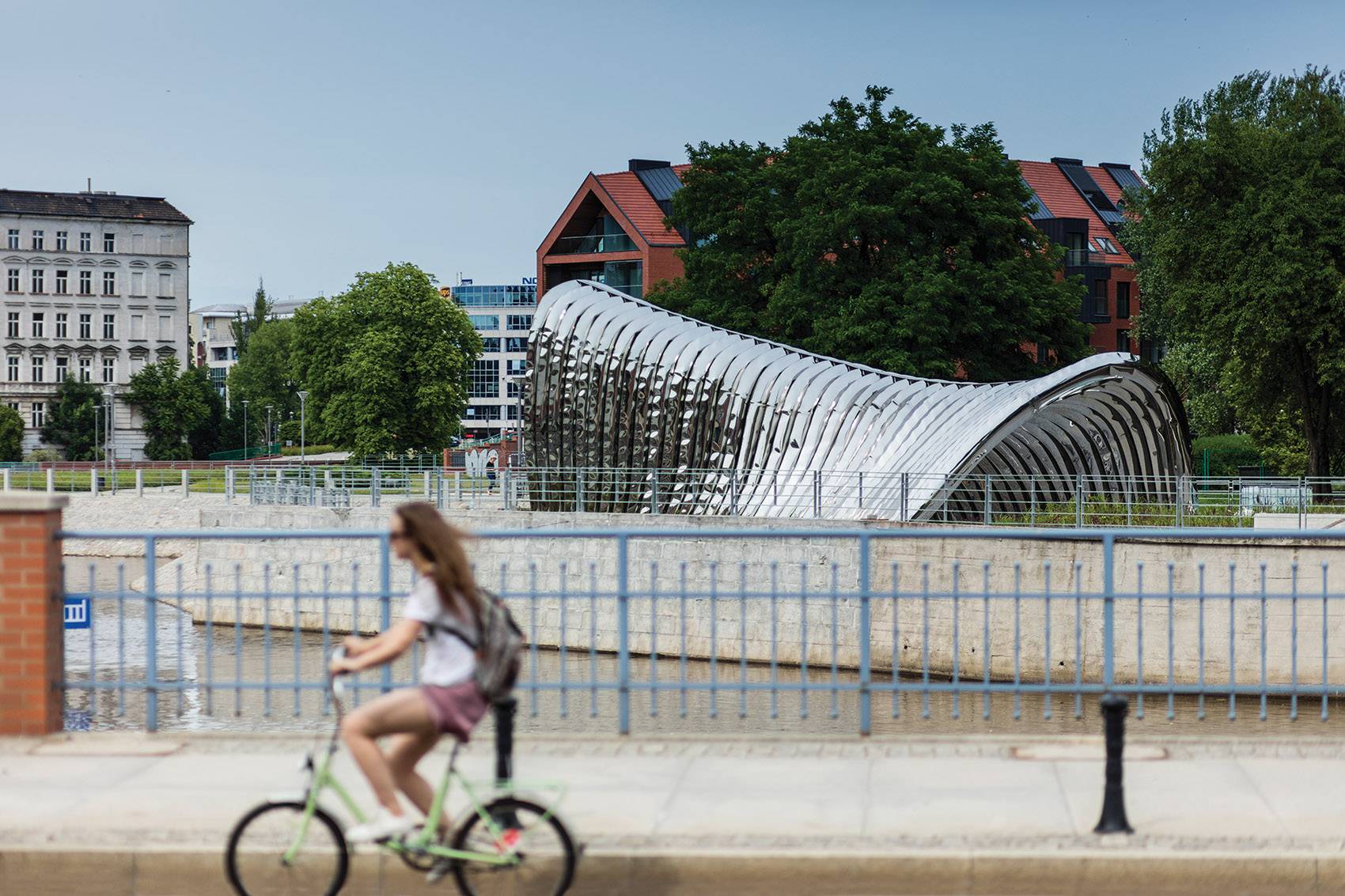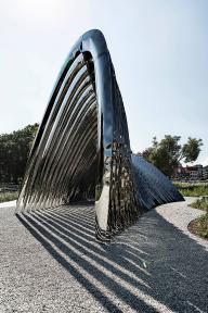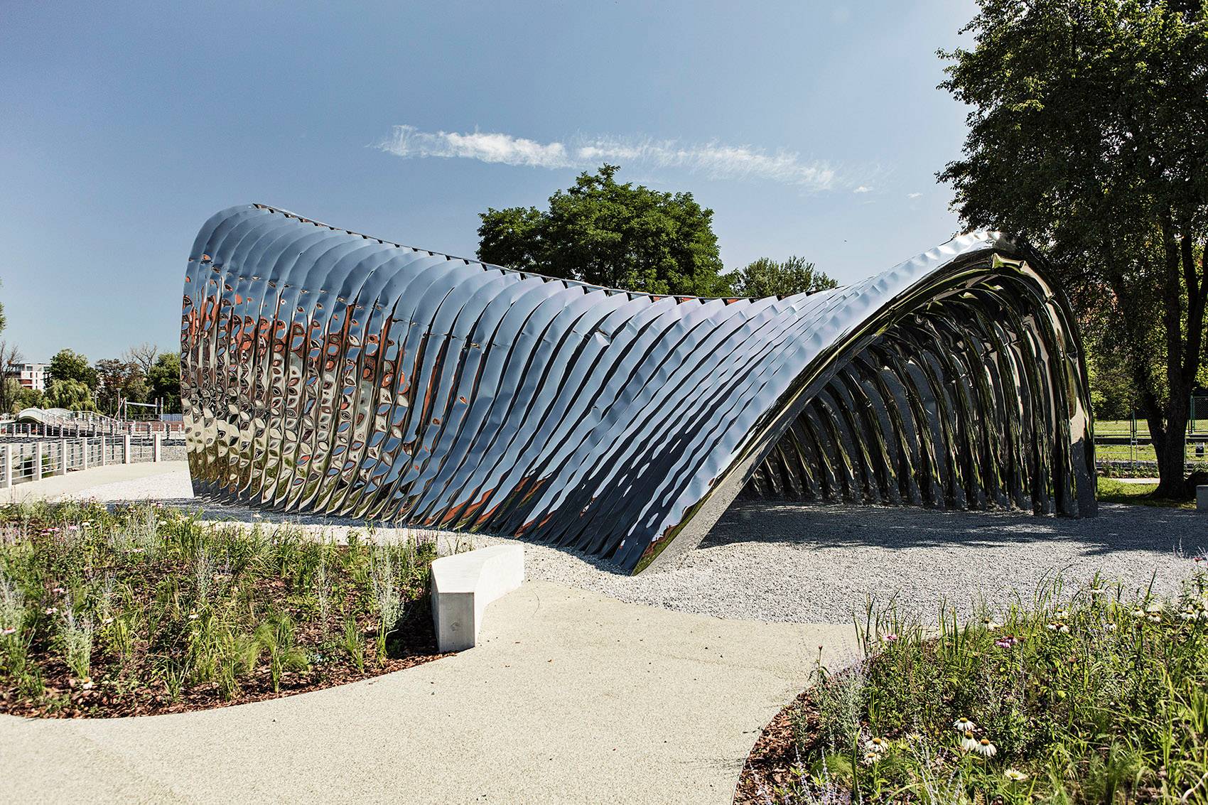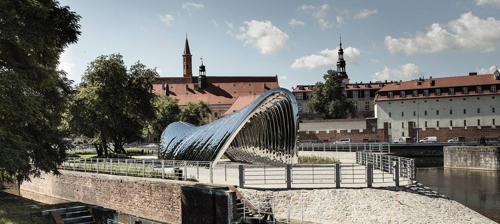 This architectural, public sculpture consists of 35 bionic steel arches referring in form to the shape of the island and most of all to construction of nearby historic architecture of Ostrów Tumski originally established in XI century. The arches together create an ultralight, durable construction, its mirror-polished surface reflects the surroundings and gives the effect of a naturally growing sculpture that changes throughout the day and seasons.