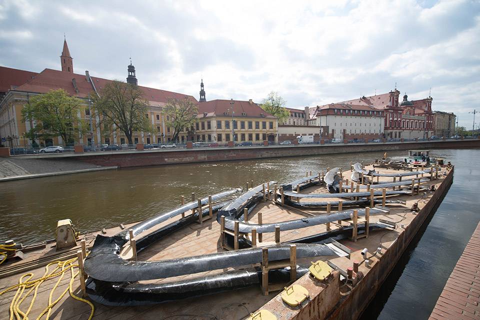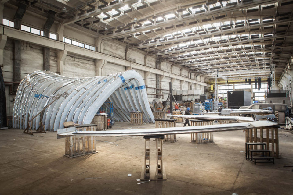 考慮到雕塑的位置和尺寸,每個拱形單元均在城市東北部的一個舊船廠中制造,然后用駁船直接運送至Daliowa島。