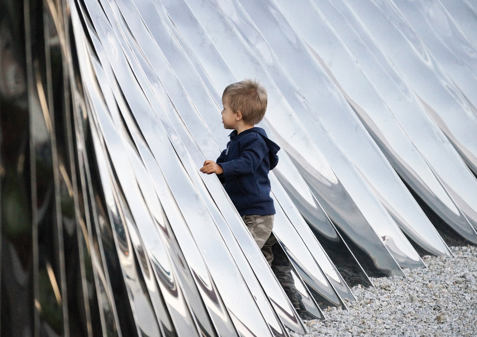 Slightly wavy surface of mirror-polished stainless steel resembles surface of the water which reflects everything around and changes throughout the day and seasons. NAWA is the first object made with FiDU technology for such an immense scale and also its manifesto. The initially controversial project became a popular spot for meetings, photo shots and artistic events.