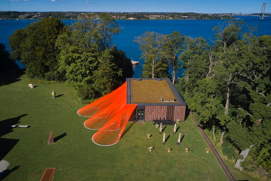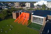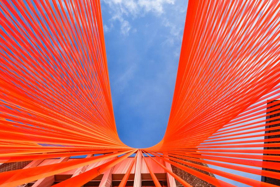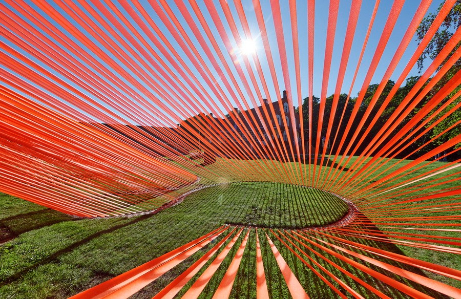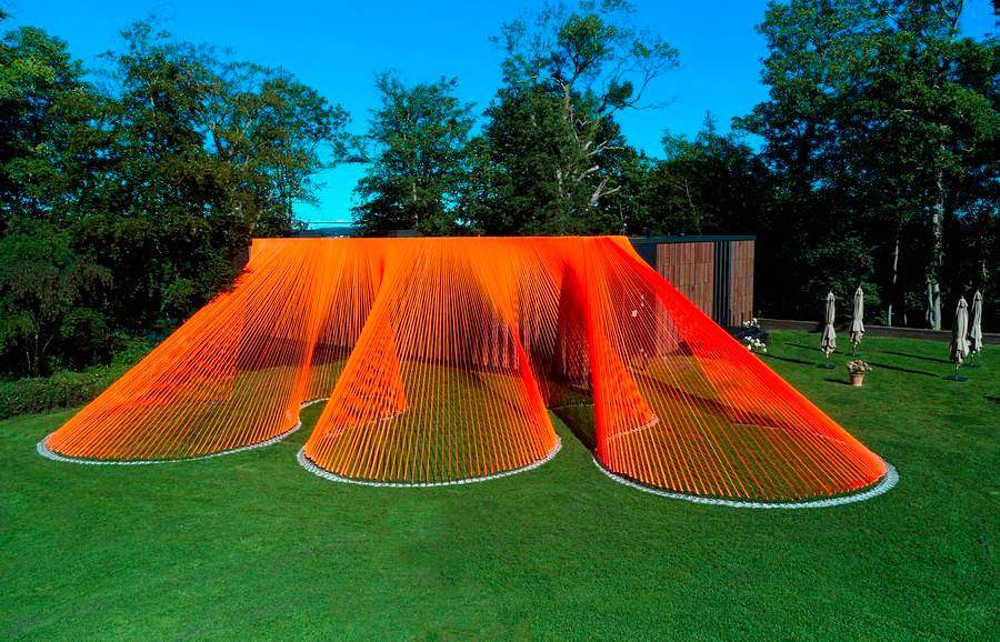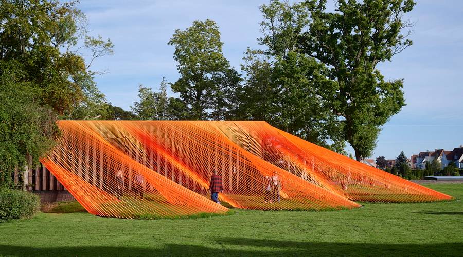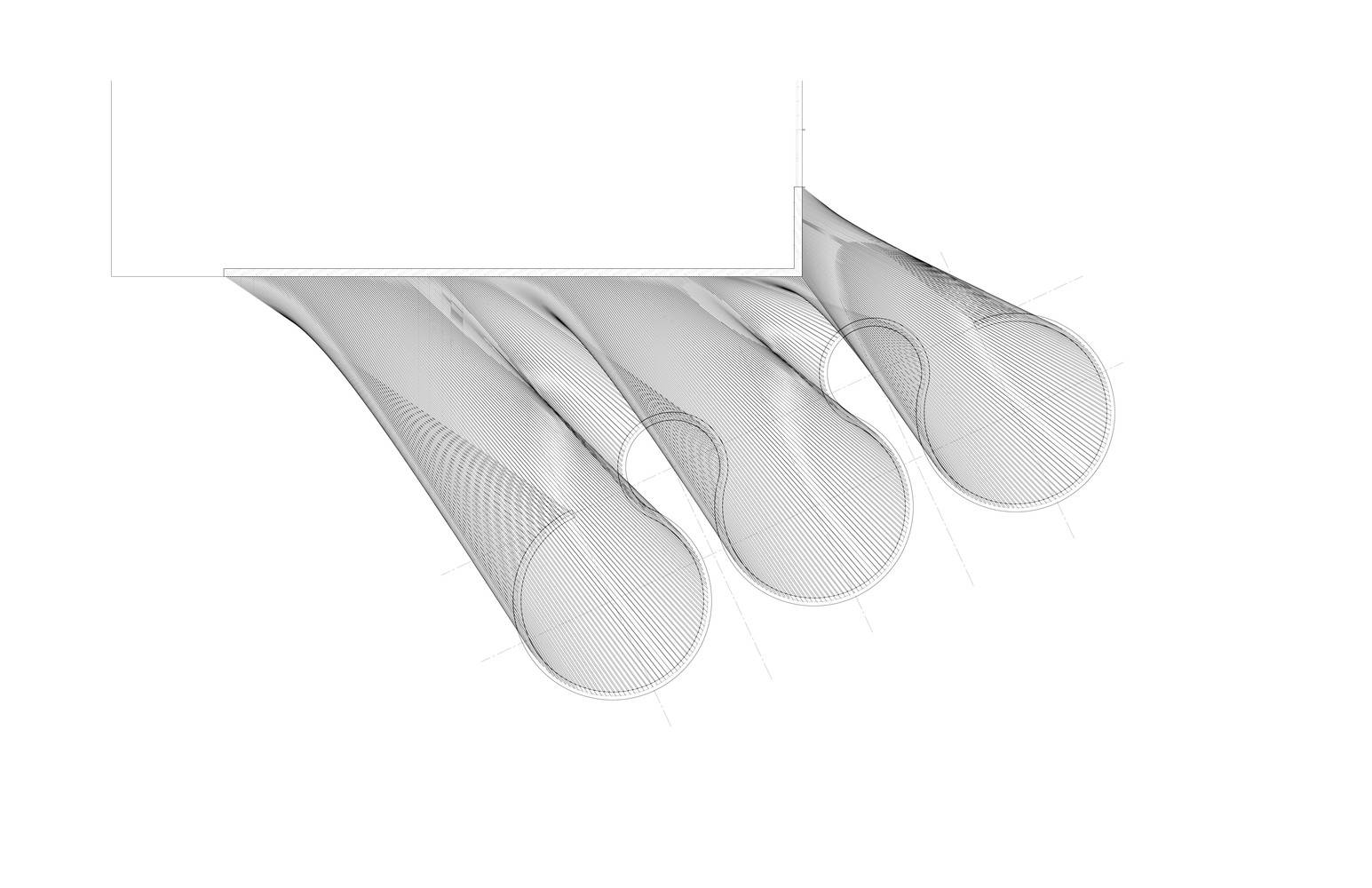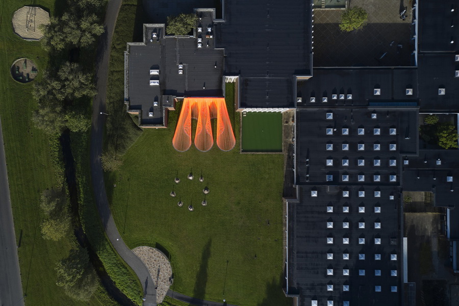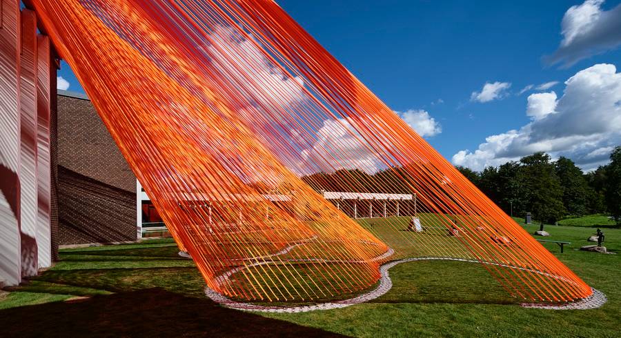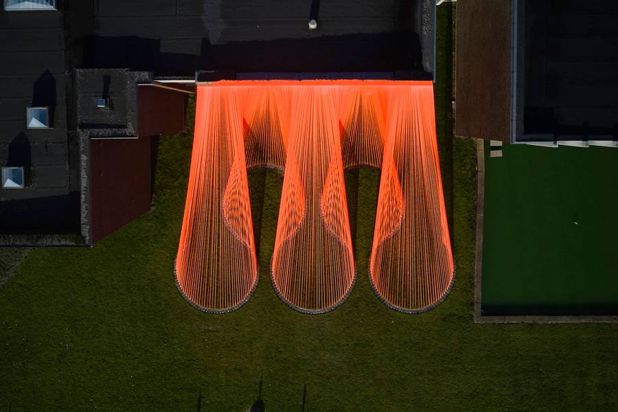 每個裝置都由近400根上了涂料、從地面拉伸至屋頂邊緣的網(wǎng)狀織帶組成。在與地面相接之處,波狀起伏的織帶自身向內(nèi)彎曲,創(chuàng)造了一系列細(xì)胞孔狀空間。盡管織帶形成的裝置表面分隔了這些獨(dú)立的空間,但孔隙提供了它們彼此之間的視覺貫通。線性的頂部錨固位置與彎曲的地面錨固圖案之間的相互作用導(dǎo)致了視覺疊加、密度與透明性的差異化且復(fù)雜的條件。裝置鮮艷的橘色形成一個焦點,吸引好奇的路人與之展開互動。