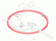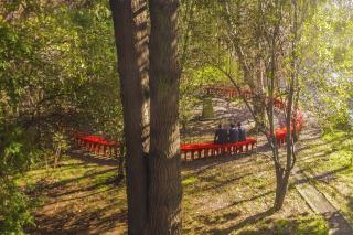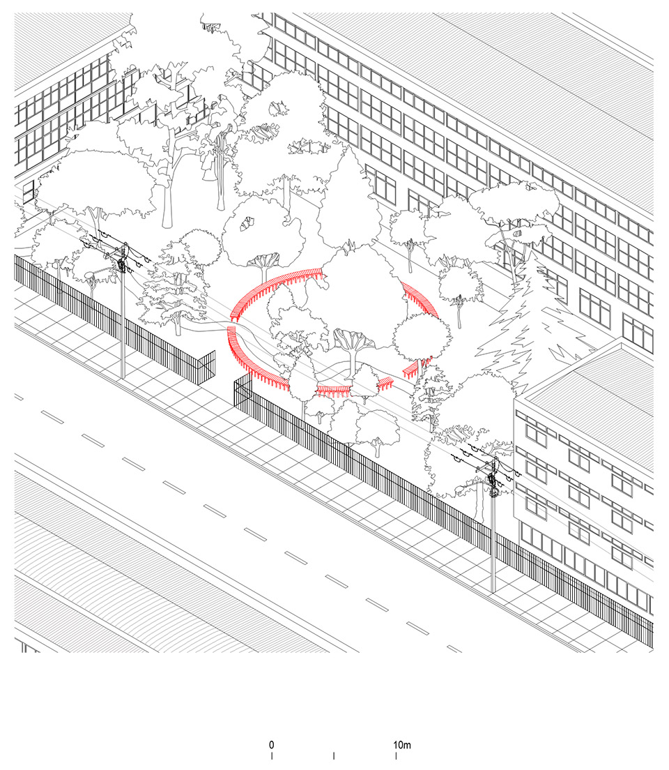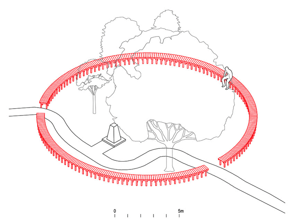 Alejandro Merino植物園已經(jīng)成為當(dāng)?shù)厝藗冇洃浿械囊徊糠?,為了?shí)現(xiàn)公園的復(fù)興,設(shè)計(jì)師利用這種懷舊情緒,并設(shè)想出包括附近高中人群在公園中的各種可能的活動(dòng)場(chǎng)景,設(shè)計(jì)了一個(gè)連續(xù)的圓形長(zhǎng)凳裝置。裝置直徑14米,由67個(gè)重復(fù)木制模塊單元組成,兩端被現(xiàn)有的小路打破,形成出入口。長(zhǎng)凳被小心地放置在樹木之間,在不破壞當(dāng)?shù)貙氋F自然遺產(chǎn)的同時(shí),巧妙地創(chuàng)造出一個(gè)融入景觀的室外教室。
