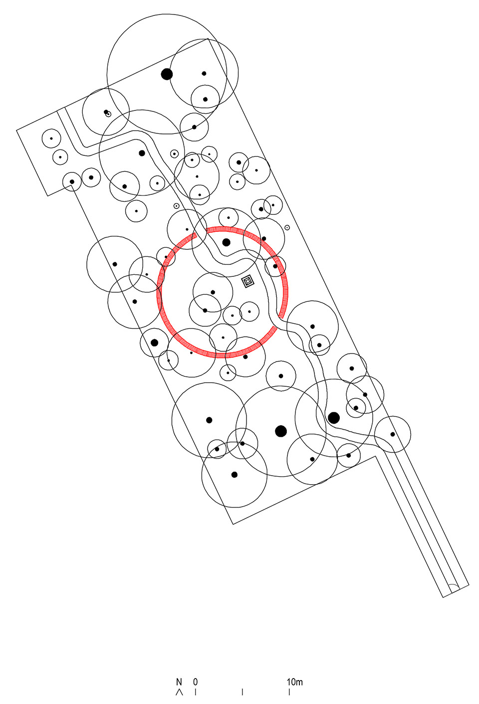 For the restoration, after recording the nostalgia and possible uses among the high school community, a continuous circular bench was proposed for the garden, some 14 meters in diameter, formed by a systematic repetition of 67 wooden modules, that is only broken by the existing path, placed carefully between the trees to create a new classroom amid the landscape, leaving the valuable natural heritage of the place unaltered.