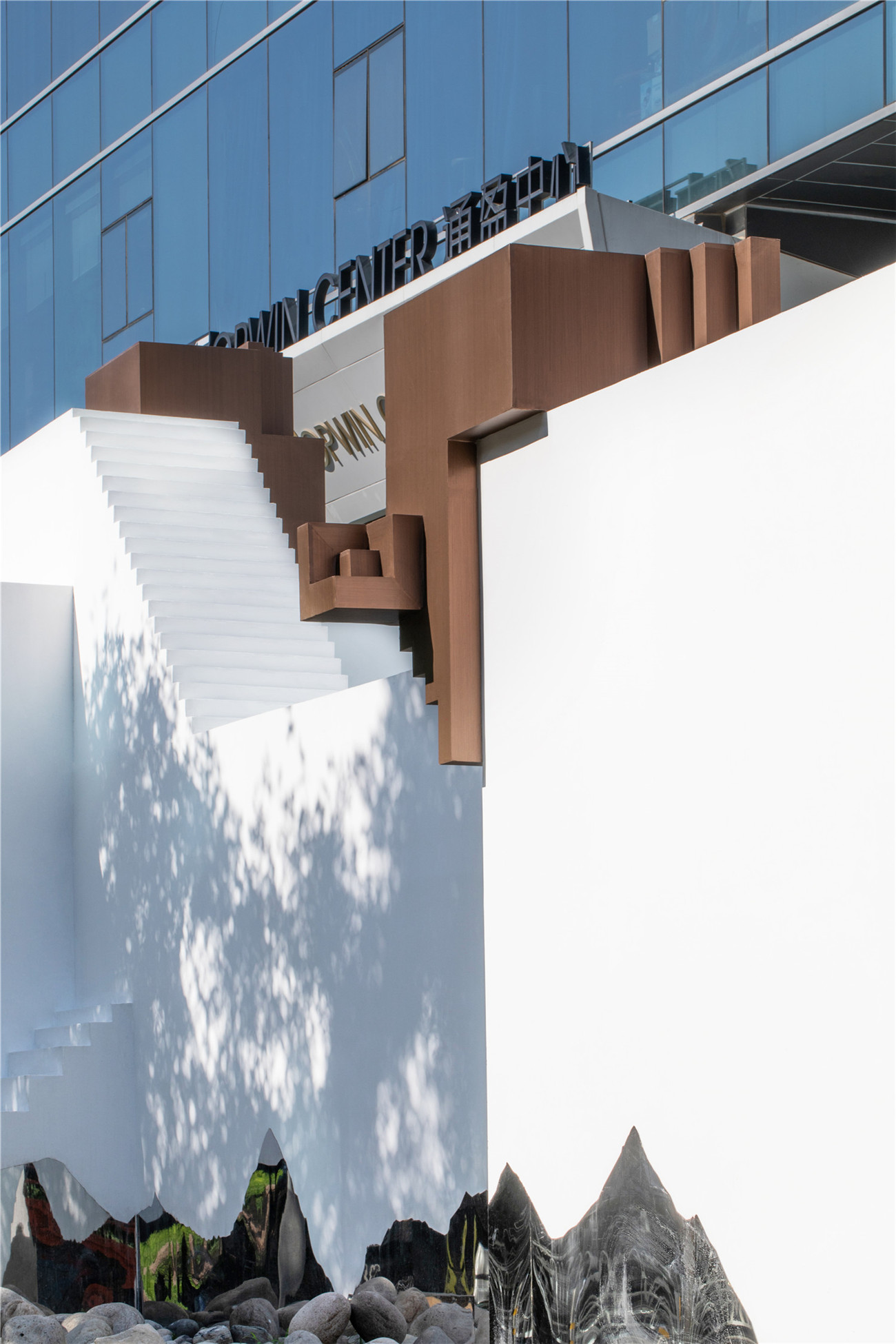 In contrast to the emphasis on a building’s solidness, the architect tries to give more graphical features to the building’s surface materials. The winding lines on its fa?ade are in fact taken from the skylines of Namcha Barwa.According to the most accurate description of Namcha Barwa, the mountain pierces into the blue sky like long spears, with thick white snow and dark rocks that overwhelm human eyes. Located in the deep end of the mysterious Himalayas, it hides among the clouds all year around, but is still connected with the world we are living in, sharing the same destiny.Through the Mandalas Pop-up Digital Art Museum, Namcha Barwa falls into the bustling urban center, reflecting the noisy and earthly scenes of the human world. It also brings mysterious silver sparkles to the Mandalas Pop-up Digital Art Museum, becoming the most romantic feature on this sparsely adorned building.