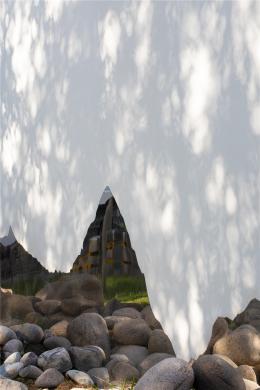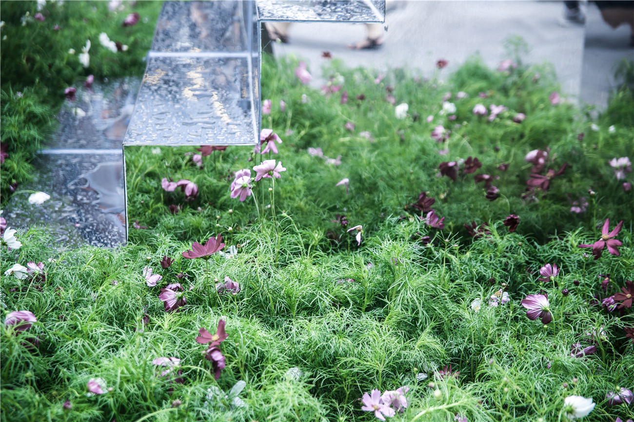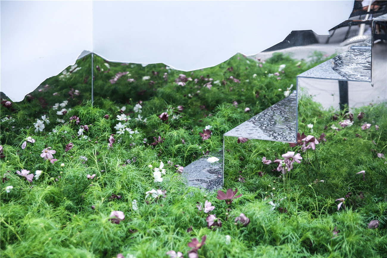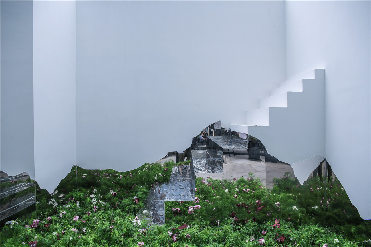 裸露粗糲的山石與來自高原的格桑花,在鏡面金屬的反射下一直綿延入建筑的深處,承托起這座懸浮于都市中的曼陀羅之丘,散落的石塊重新回到應屬之地。疏離于城市的山石與格?;ú⒎鞘墙ㄖ熧x予曼陀羅之丘的意象,卻是聯(lián)通都市現(xiàn)實與超現(xiàn)實喜馬拉雅秘境的一條道路,令曼陀羅之丘帶著觀者在現(xiàn)實世界與另一個魅力無邊的無意識和幻象的世界之間自由出入。
