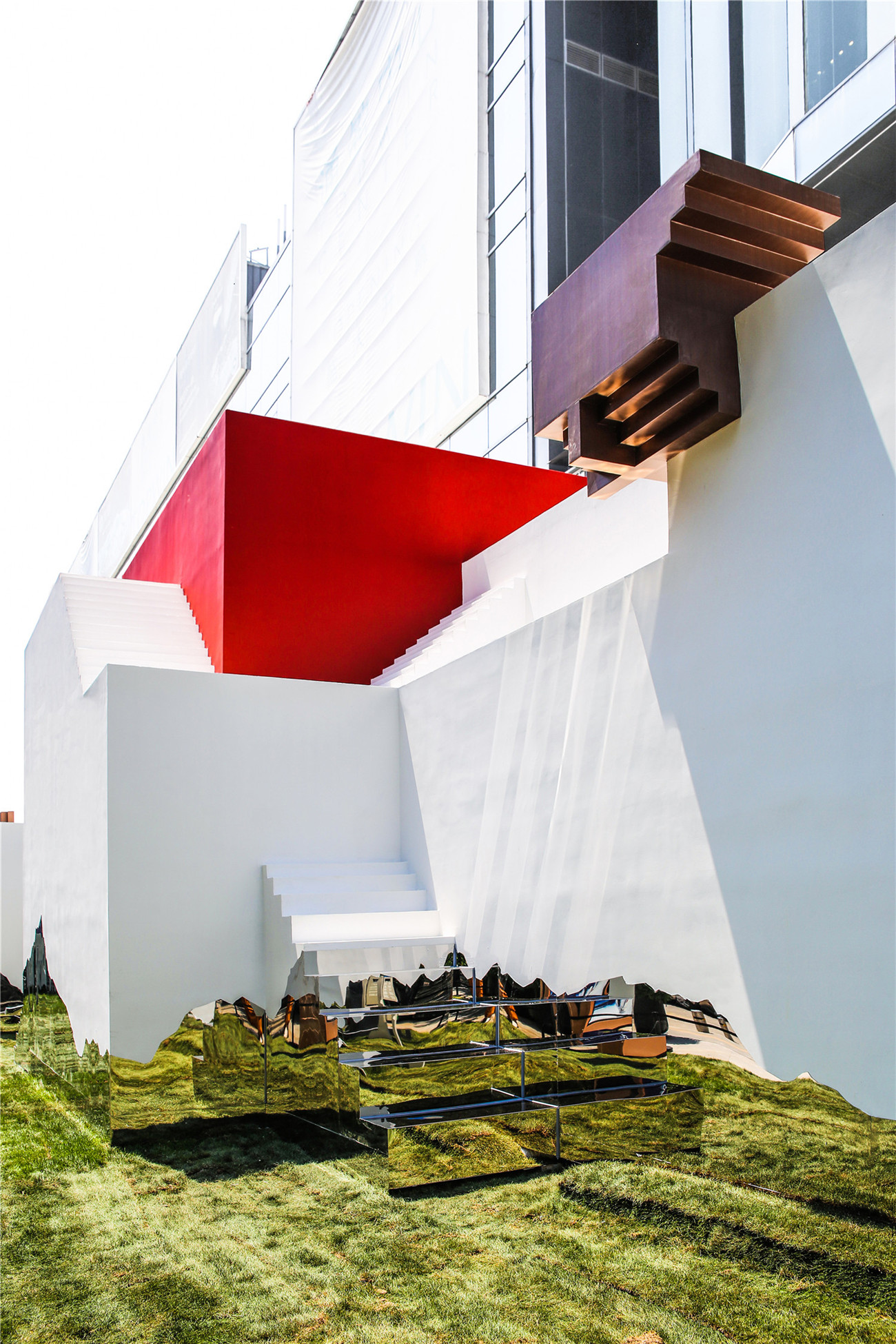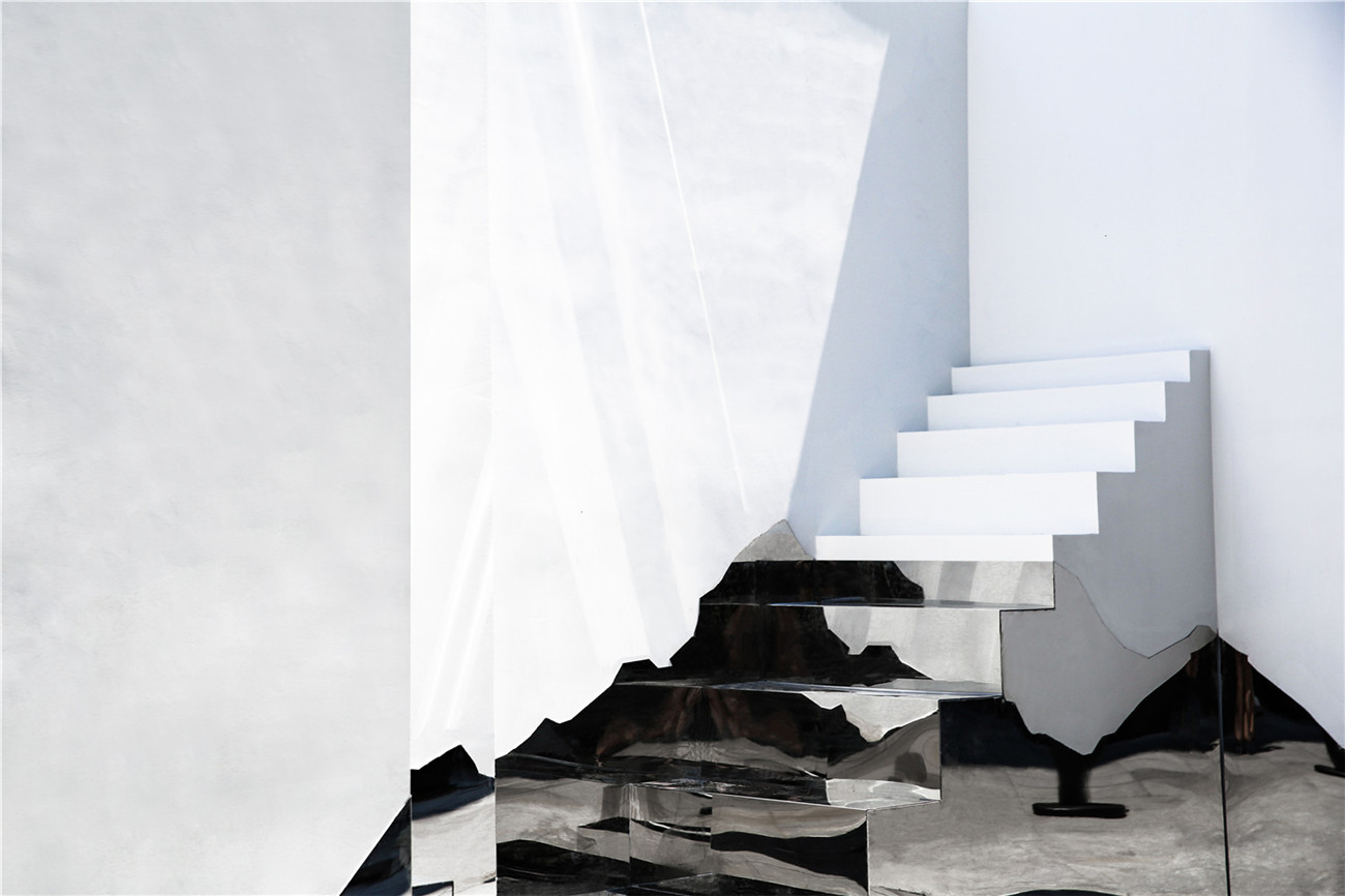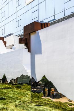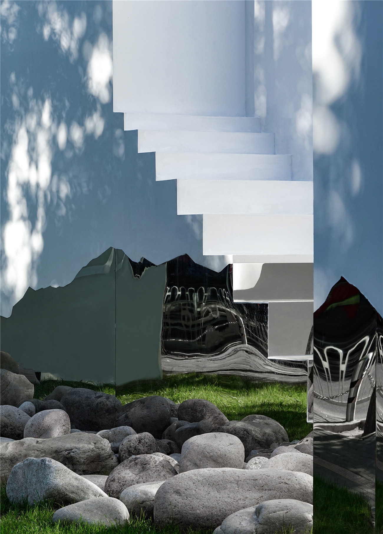 裸露粗糲的山石與來自高原的格桑花,在鏡面金屬的反射下一直綿延入建筑的深處,承托起這座懸浮于都市中的曼陀羅之丘,散落的石塊重新回到應屬之地。疏離于城市的山石與格?;ú⒎鞘墙ㄖ熧x予曼陀羅之丘的意象,卻是聯(lián)通都市現(xiàn)實與超現(xiàn)實喜馬拉雅秘境的一條道路,令曼陀羅之丘帶著觀者在現(xiàn)實世界與另一個魅力無邊的無意識和幻象的世界之間自由出入。
