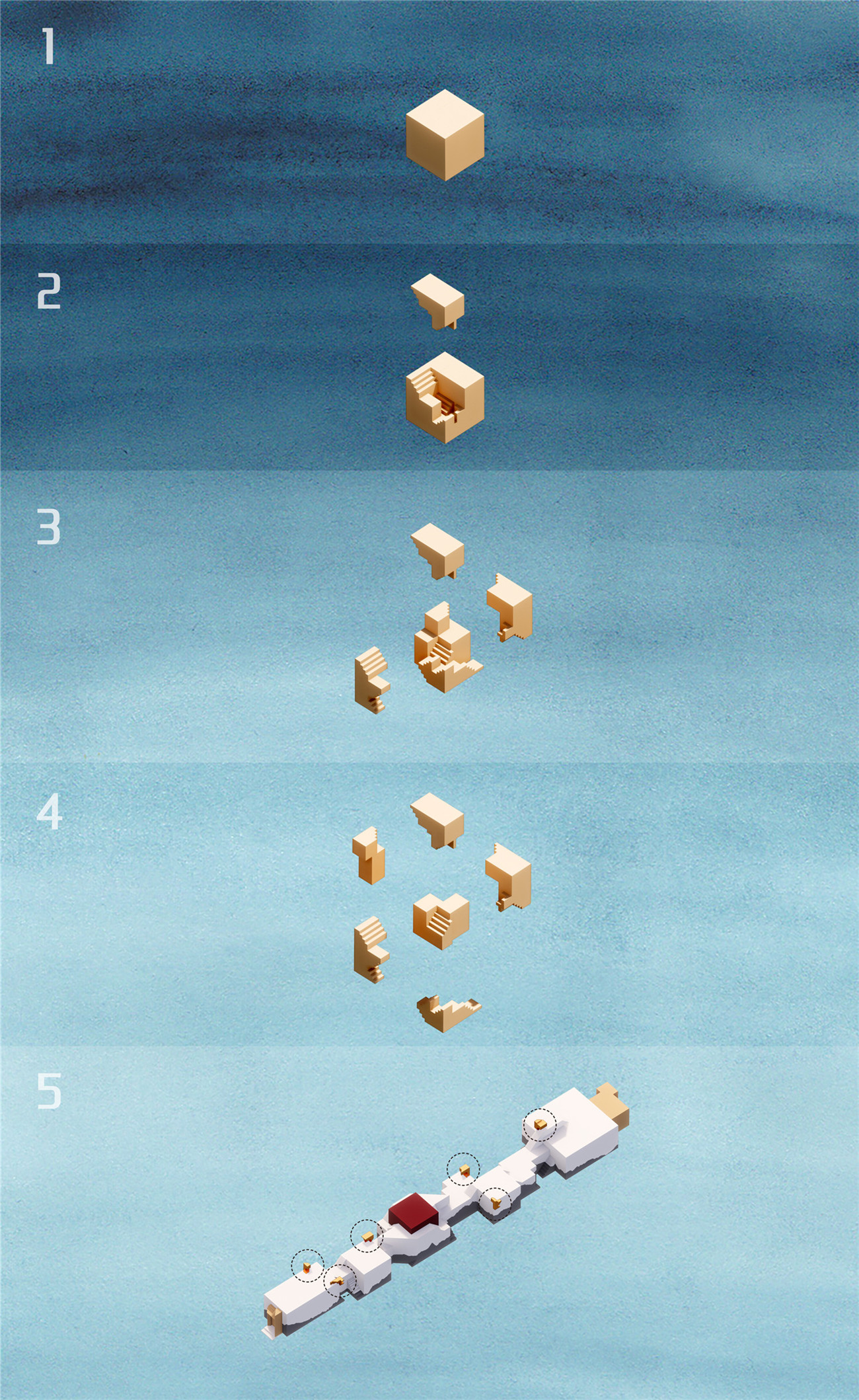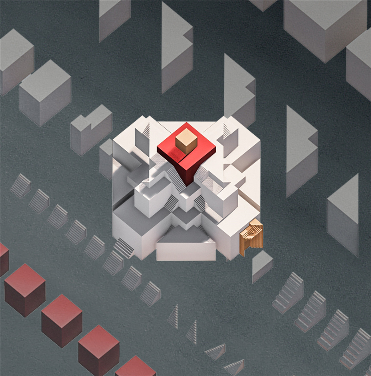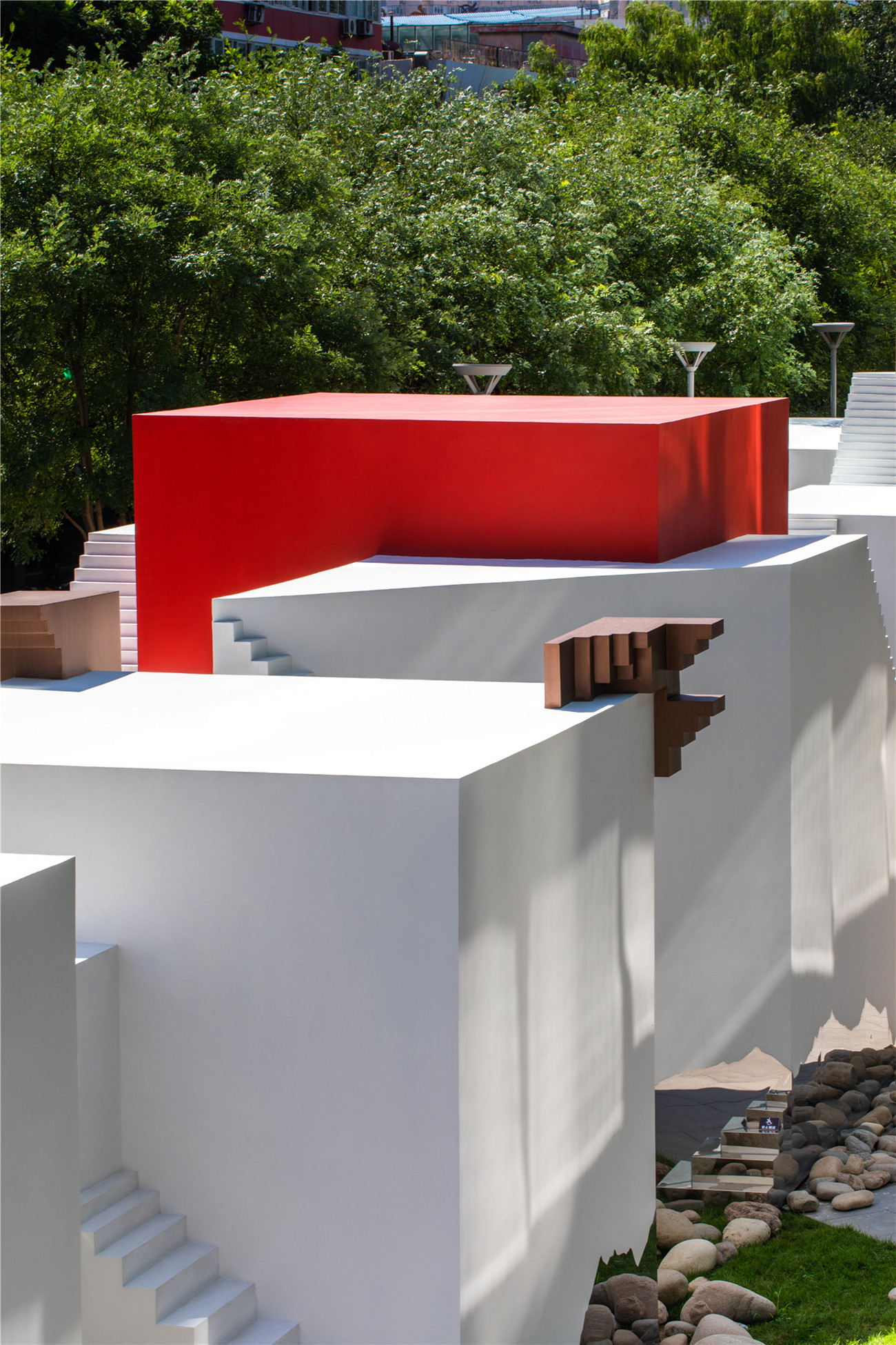 如同一套可以隨意重組的積木,曼陀羅之丘的六個金色角部體塊可以類似榫卯的方式,嵌套組合為與一個完整的方體。