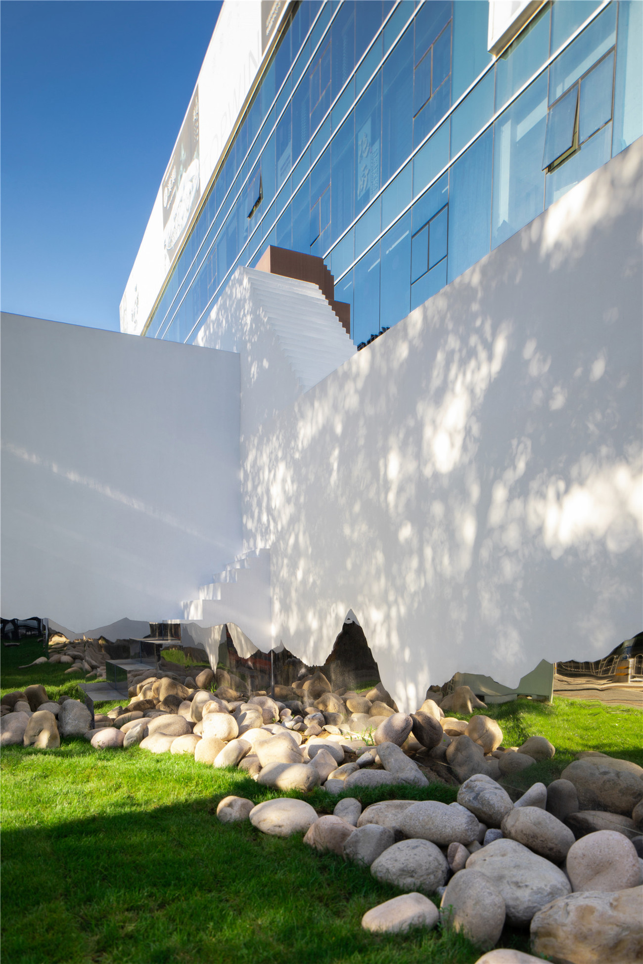 Its external layout is arranged like a labyrinth. The staggered steps surprise visitors with a perspective illusion, motivating their physical interaction with the building. Mingling with fa?ade lines that resemble the skylines of Namcha Barwa, the unadorned stones isolate the building from the full-blown metropolitan atmosphere, as if it were from outer space.It is a building that contains numerous uncertainties, fortuities, and surprises.
