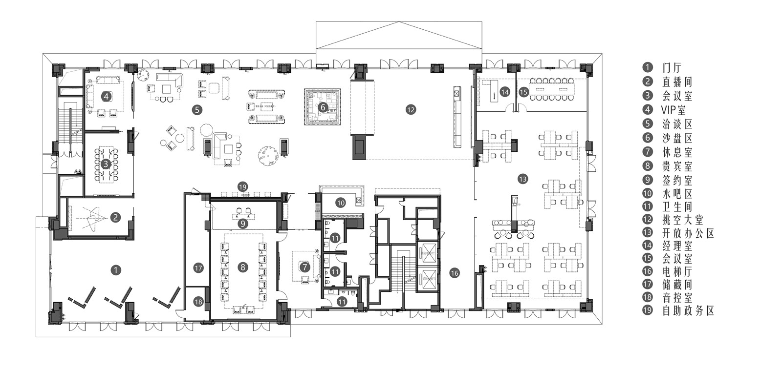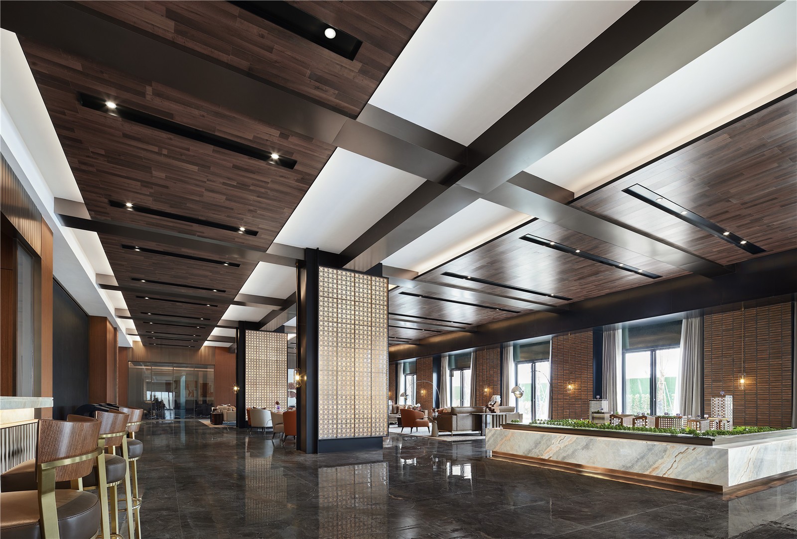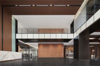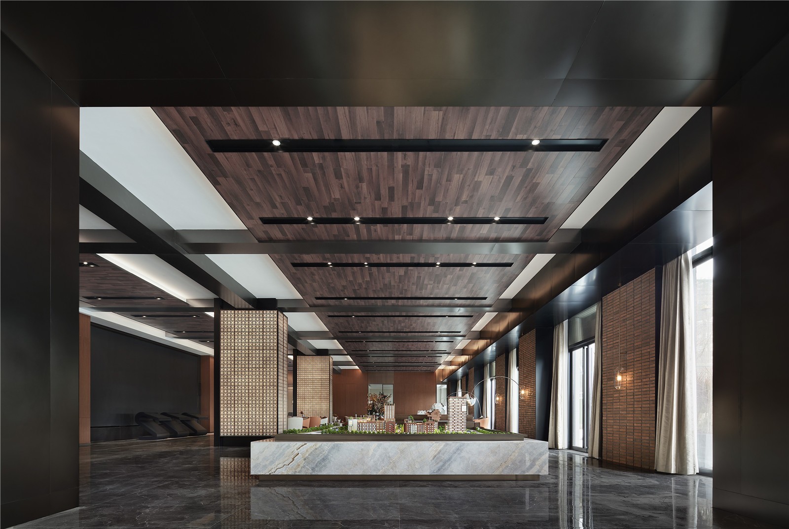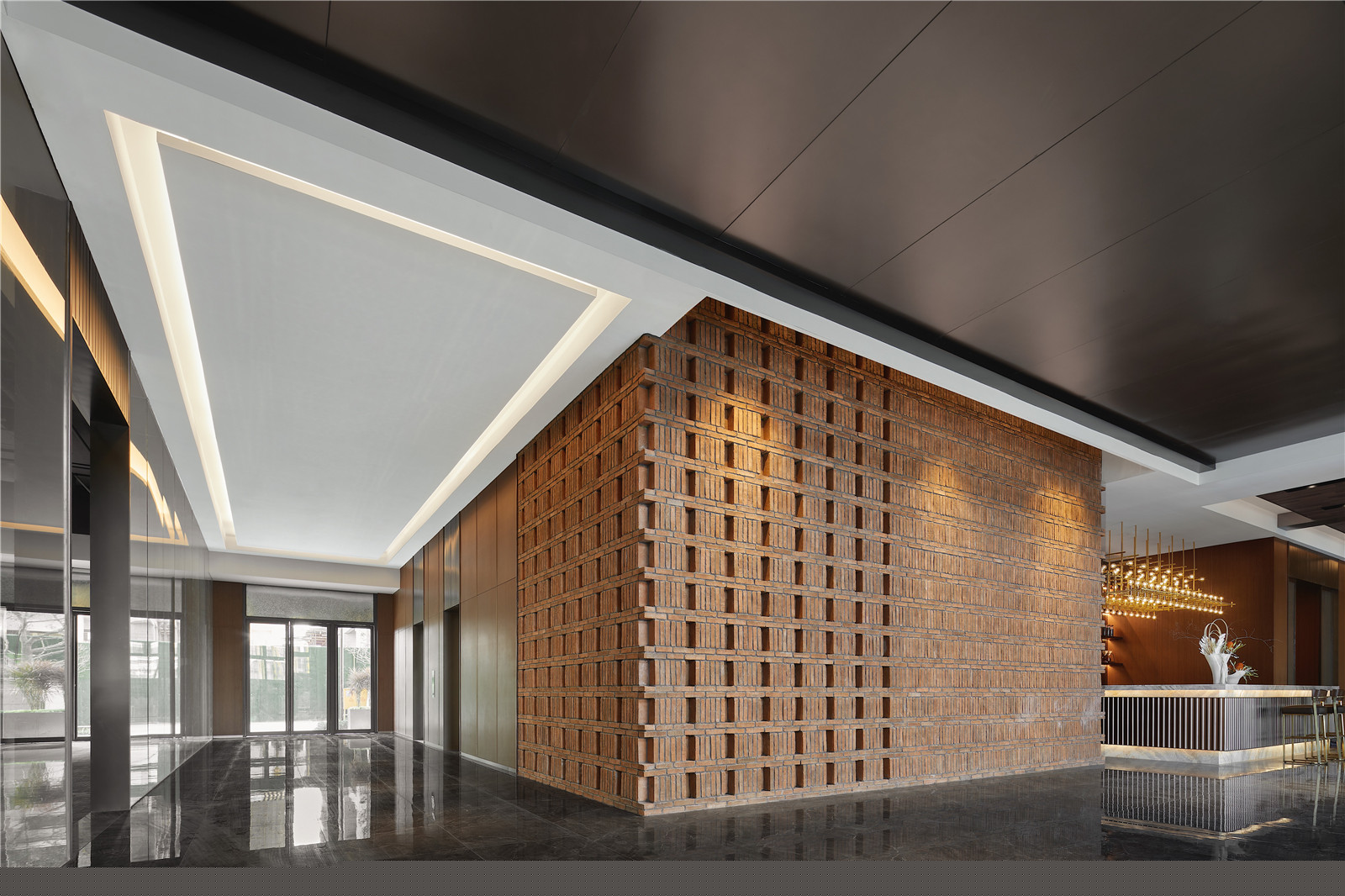 門廳一側(cè)用紅磚砌出折形界面空間,作為間隔室內(nèi)外的虛實(shí)之別。紅磚之上的留白像一張白紙,給人們提供了無限發(fā)揮的空間,拿起畫筆,可以描繪區(qū)域產(chǎn)業(yè)布局規(guī)劃、也可大書特書入駐企業(yè)的文化……墻體的鏤空切面貼上古銅不銹鋼片,在細(xì)節(jié)之處增加精致感,與優(yōu)雅的原木古銅接待臺(tái)呼應(yīng)。