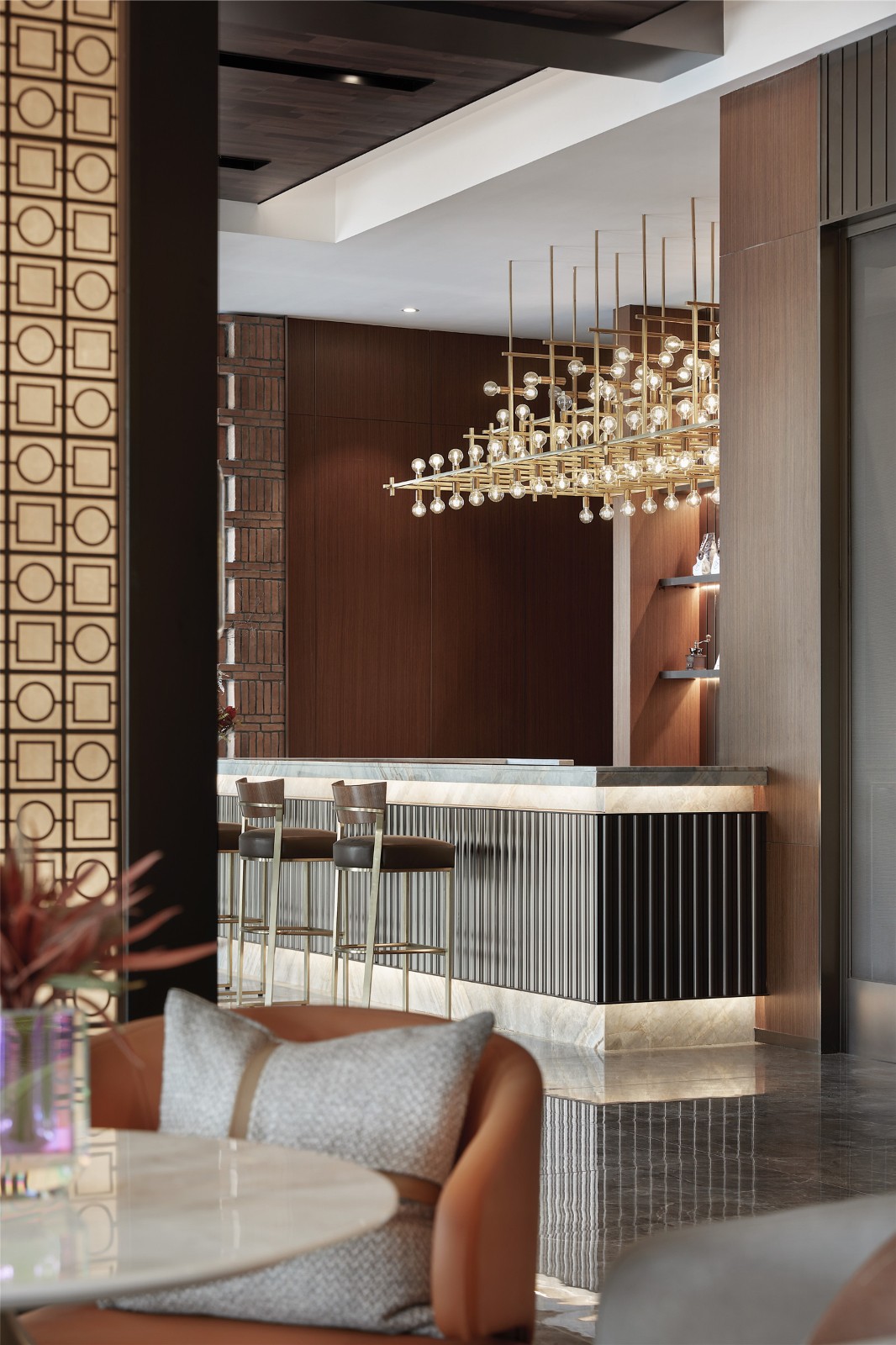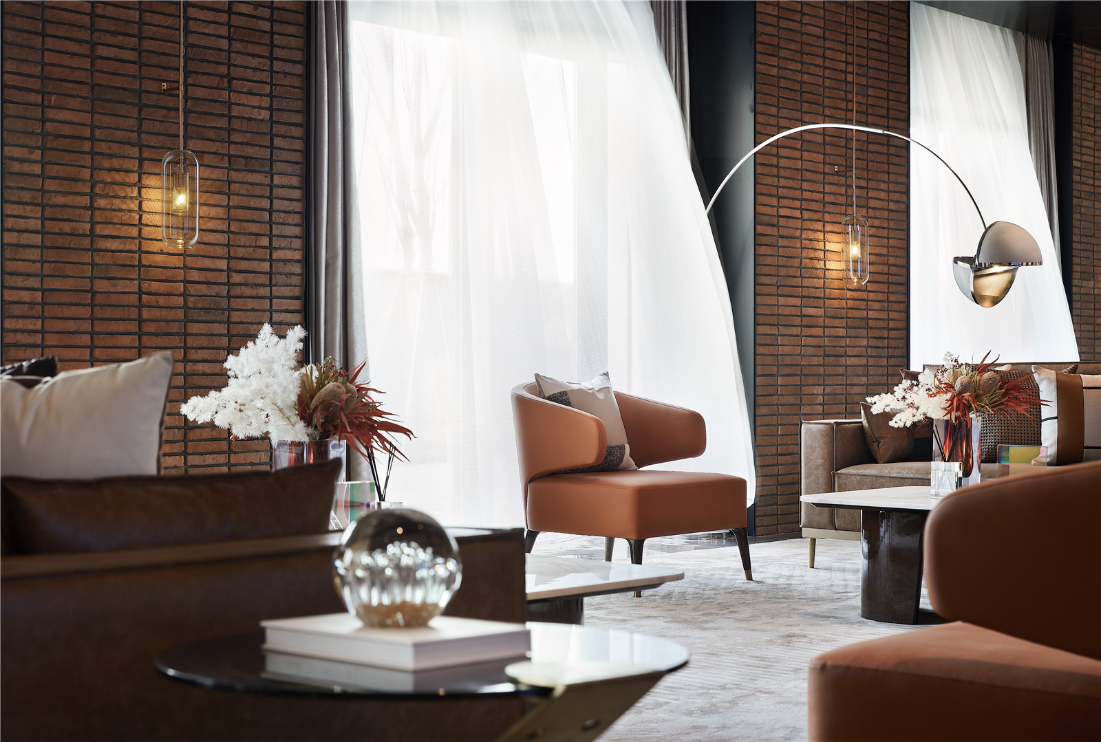 足夠多的落地窗保證了南寧熱烈的艷陽可以毫不吝嗇地分享她的光。室內(nèi)采取無主燈設(shè)計(jì),天花板射燈矩陣、沙發(fā)區(qū)域創(chuàng)意落地金屬釣魚燈、復(fù)古玻璃壁燈支撐了空間的照明需求,保證均勻舒適的光感。
