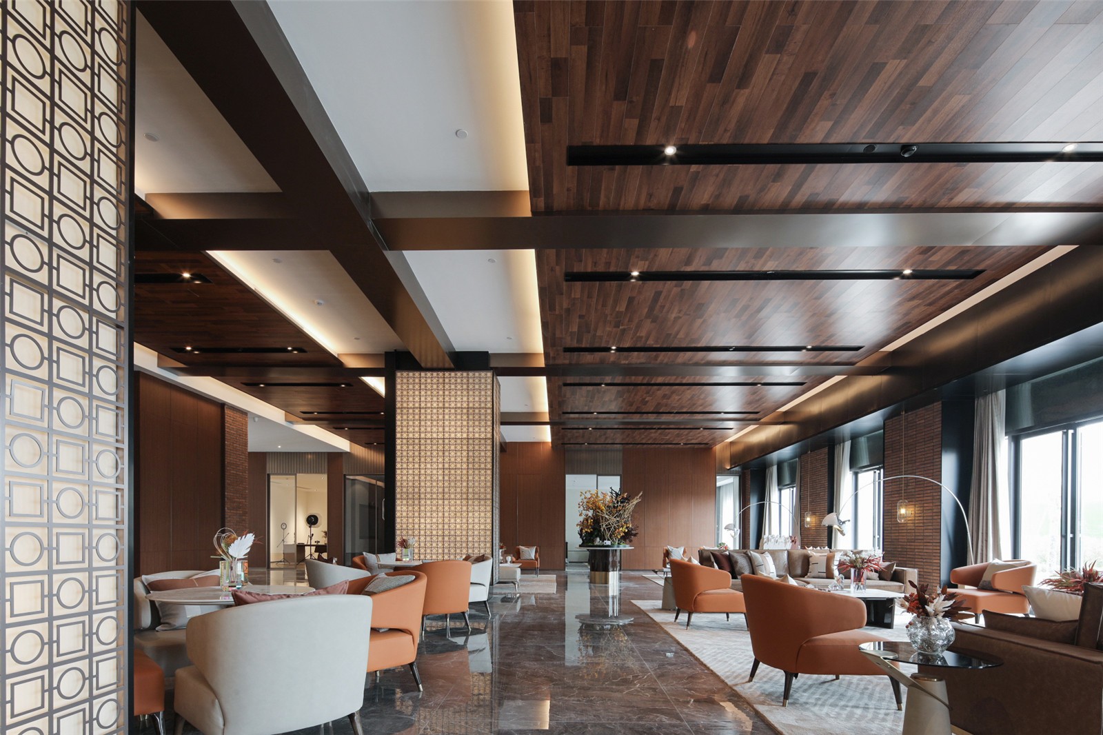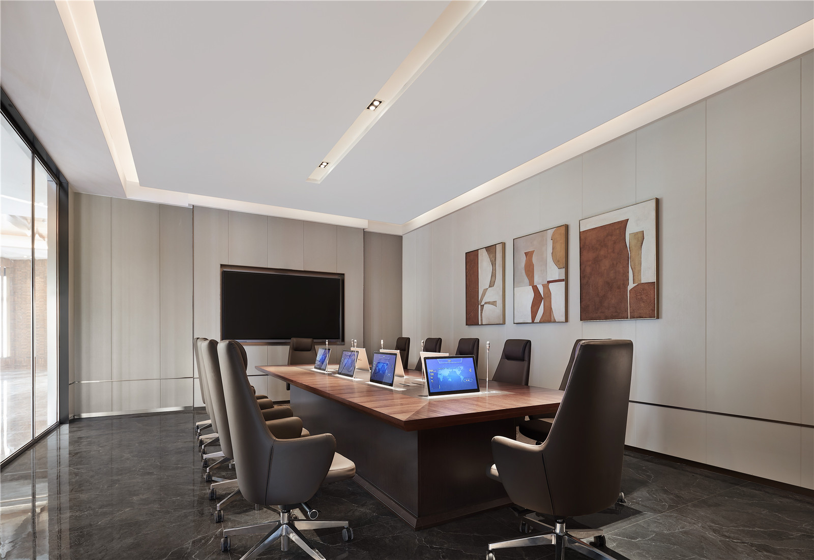 VIP室與會(huì)議室連通,方便洽談簽約,可多人圍坐。墻上皓日藝術(shù)裝置,一抹朱紅色成為了空間的精華所在,一股暖意在緩緩釋放。