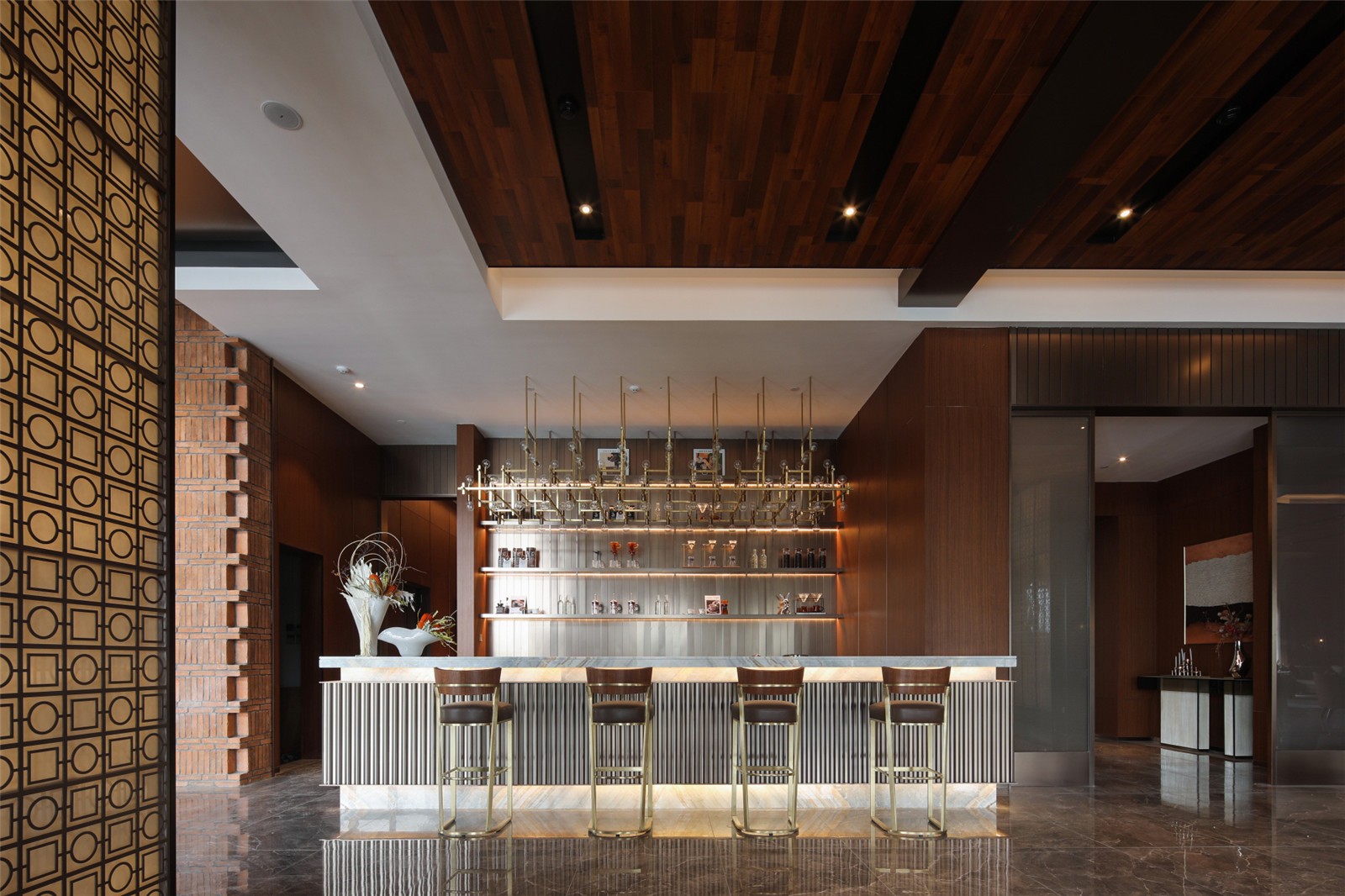 室內(nèi)天花使用木地板材料讓整個(gè)空間溫柔深邃,輔以簡(jiǎn)潔干練的古銅金屬框架,帶出粗曠的工業(yè)感。