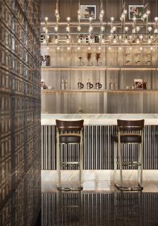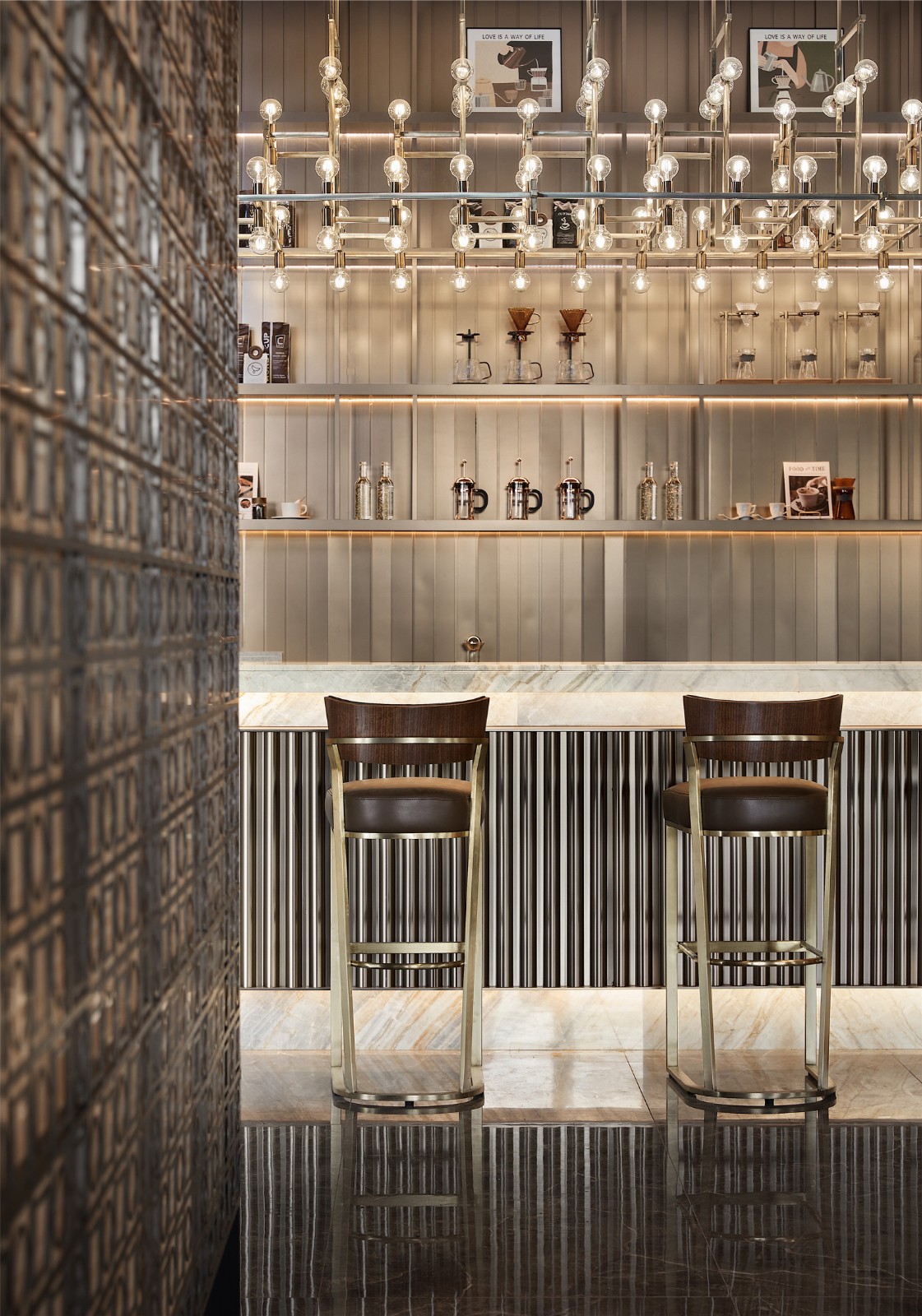 后現(xiàn)代主義的吧臺(tái)設(shè)計(jì)過目難忘,一種華麗的眩暈感撲面而來,黃銅吊燈和黃銅高腳椅,吧臺(tái)的不繡鋼倒影在水磨石地板,讓視覺無限延展。古銅色雕花板精致的花紋和氤氳的暖色,舒緩了吧臺(tái)銀色金屬的冰冷感。冷暖組合下烘托出意味深長(zhǎng)的文藝片故事感,客人逐漸地釋放出更多的情緒。