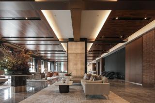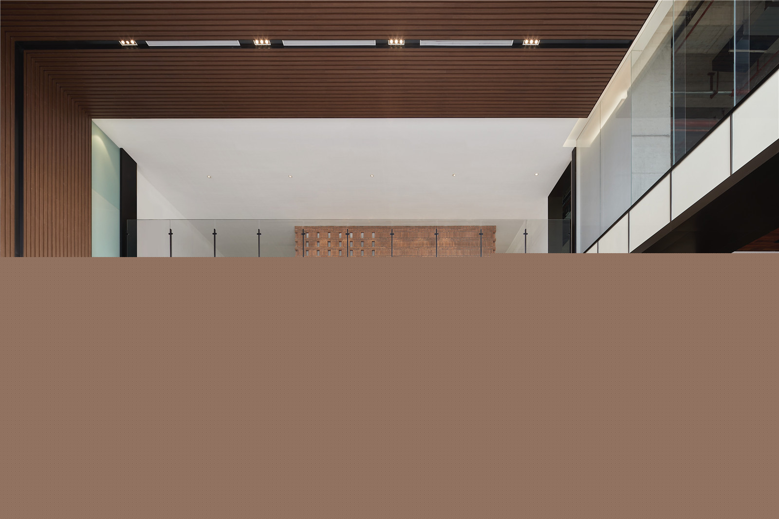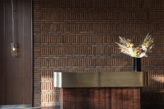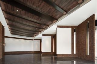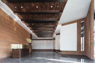 挑高大堂主視覺是一面到頂?shù)募t磚墻,一面墻卻用兩種方式砌處不同的花樣,有趣地用紅磚的不同可能性。木地板天花轉(zhuǎn)折成接待臺(tái)的背景墻,消除另一側(cè)玻璃材料帶來的“輕”,增加空間莊重感。