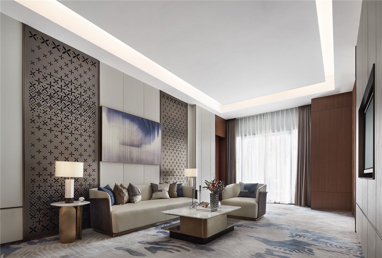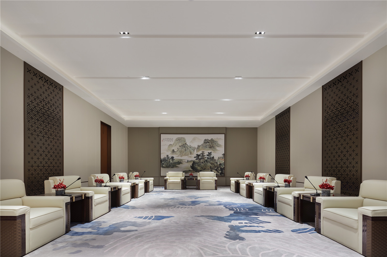 貴賓室之間選用中式孔雀藍(lán)聞地毯鋪滿,背景山水壁畫提升空間的清雅格調(diào);米白色的單人沙發(fā)椅配備發(fā)言麥克風(fēng),簡(jiǎn)潔干凈的墻面搭配金屬雕花板,營造出現(xiàn)代大氣空間氛圍,為一場(chǎng)成功的會(huì)晤鋪墊基石。