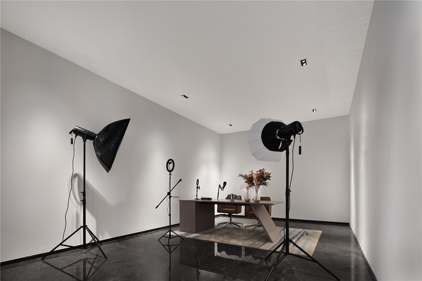 兩個(gè)攝影燈向人們表明了這個(gè)空間的功能,直播和攝影的需求多變且需要較大的發(fā)揮空間,因此直播攝影空間的設(shè)計(jì)采取了極簡(jiǎn)主義的設(shè)計(jì),白墻和簡(jiǎn)單的大理石地板,其余地交給天才使用者去裝點(diǎn)。