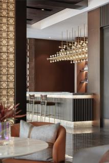 愛馬仕橙和米白色皮質(zhì)硬包沙發(fā)圍合成數(shù)個(gè)給人們交流的小片區(qū),承重柱用鵝黃色的云石片裝飾貼滿,并以古銅金屬花紋全包圍,成為了空間的點(diǎn)睛之筆,也幫助奠定洽談區(qū)復(fù)古有趣的氣質(zhì)。