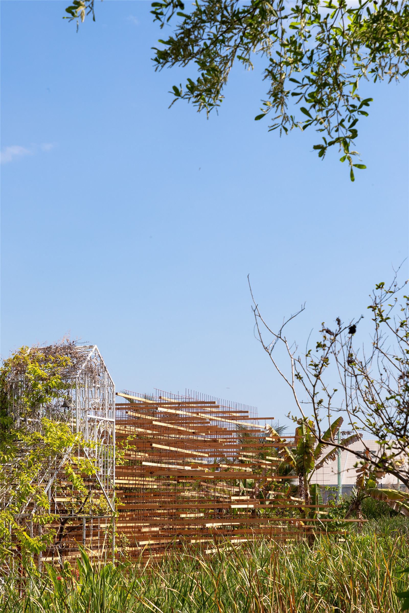 我們決定創(chuàng)造一個(gè)可以融入周圍環(huán)境的結(jié)構(gòu),其特色在于混合、輕盈、隱匿、滲透……最終我們建造了一個(gè)有機(jī)結(jié)構(gòu),如同一堆稻草堆疊在花園之中。