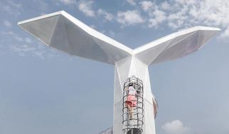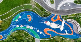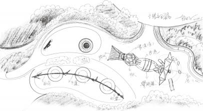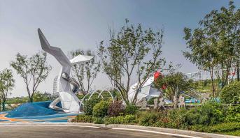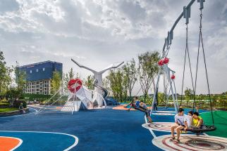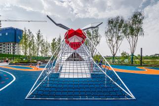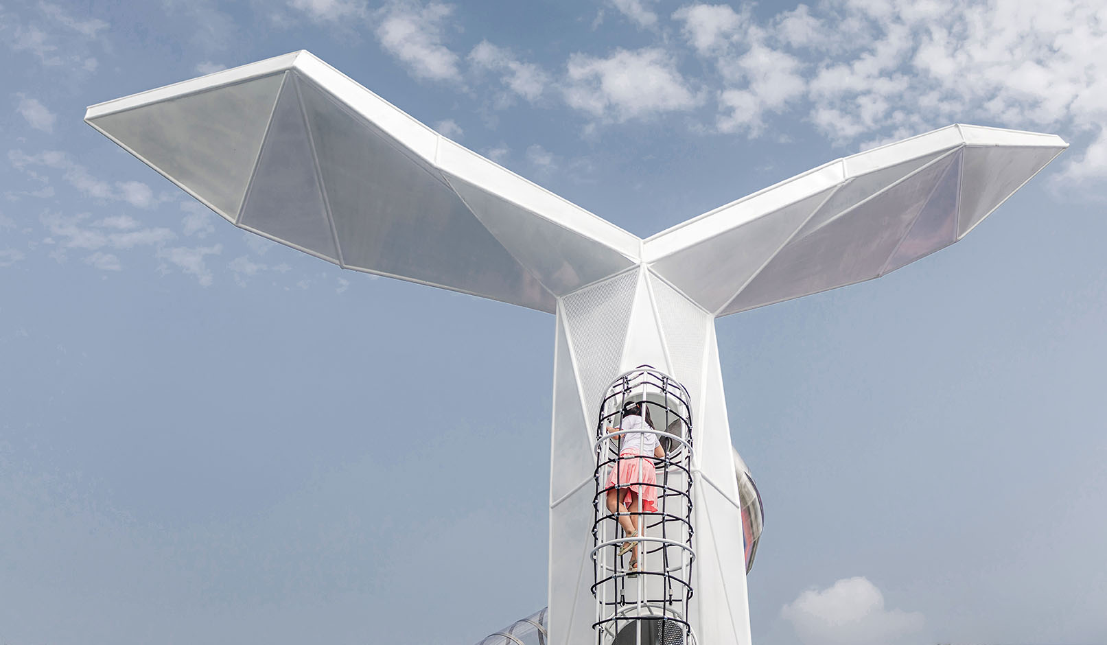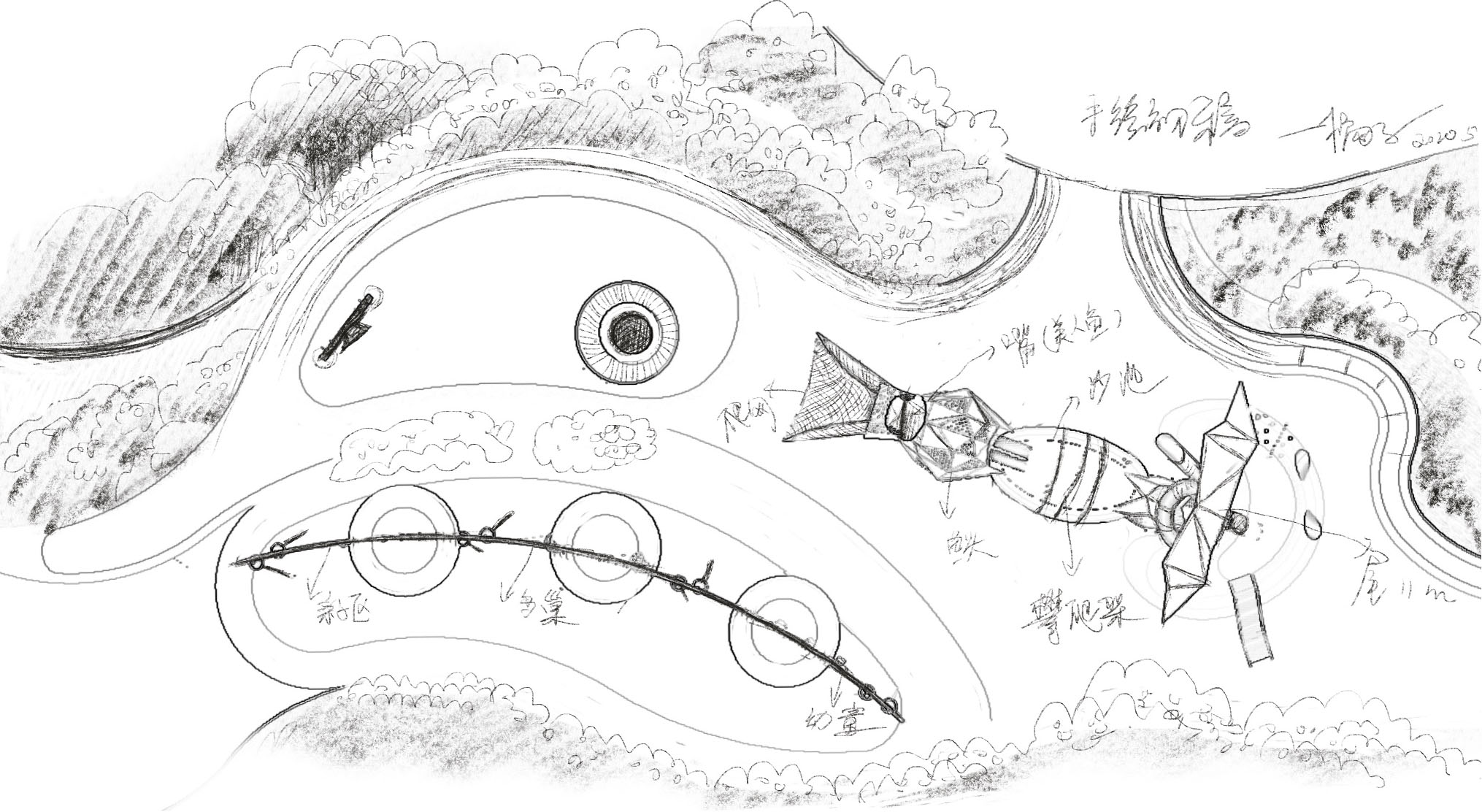 在北沙河公園灣淺灘有一條神奇的大魚,只要找到它,憑借智慧攀上滑梯的入口,它就能告訴你關(guān)于它的傳說,眺望整個公園的美景。抵達滑梯的途徑有兩條,一是從魚頭攀爬起伏的錦鯉云網(wǎng),二是爬上魚尾的礁石穿過垂直的爬網(wǎng)天梯。