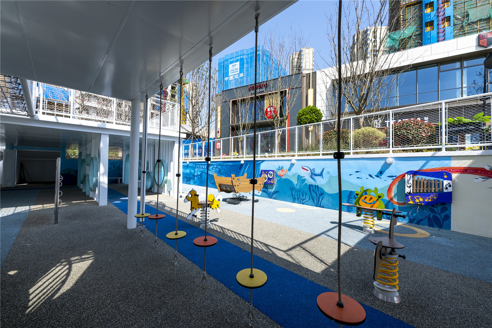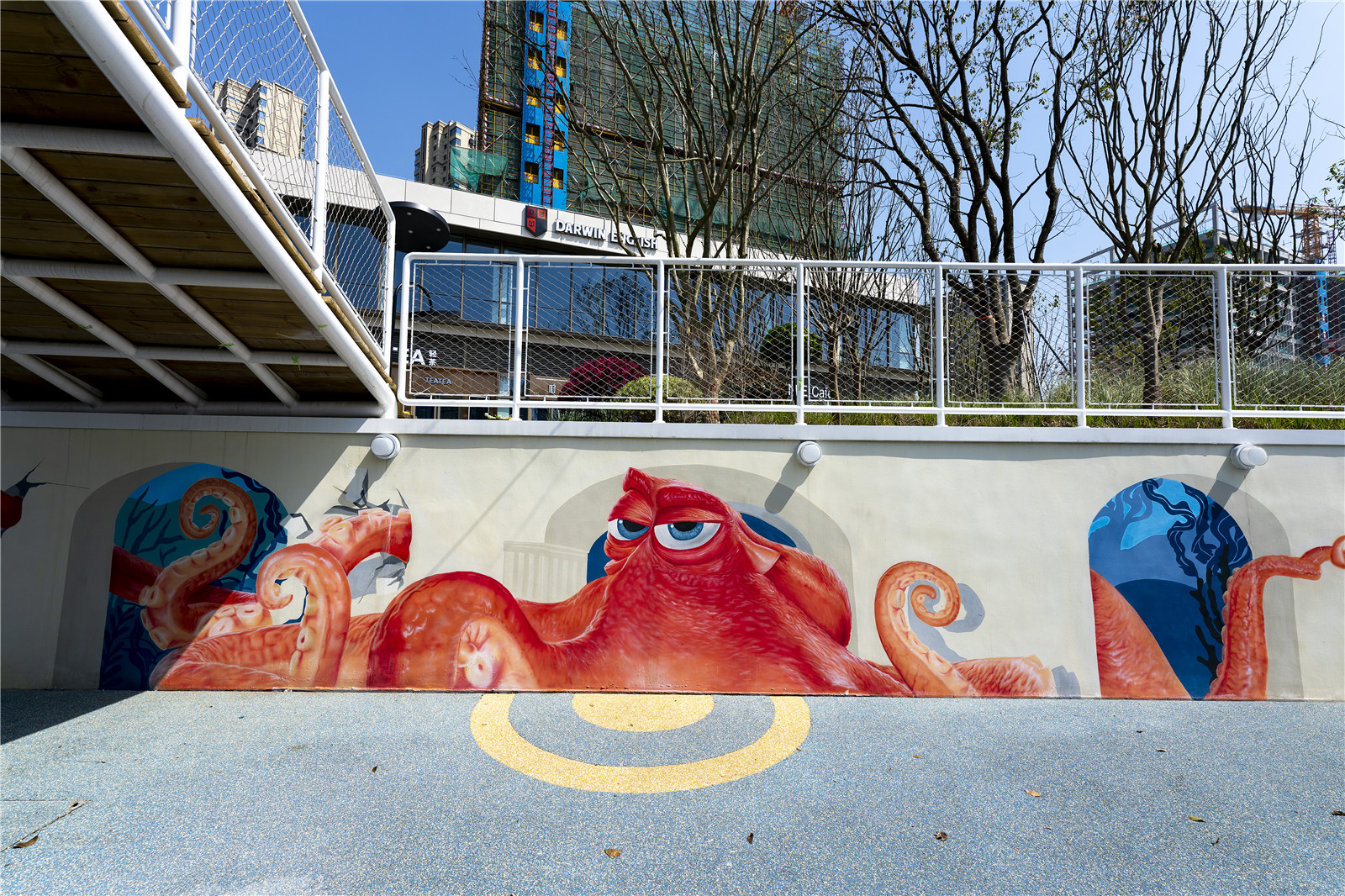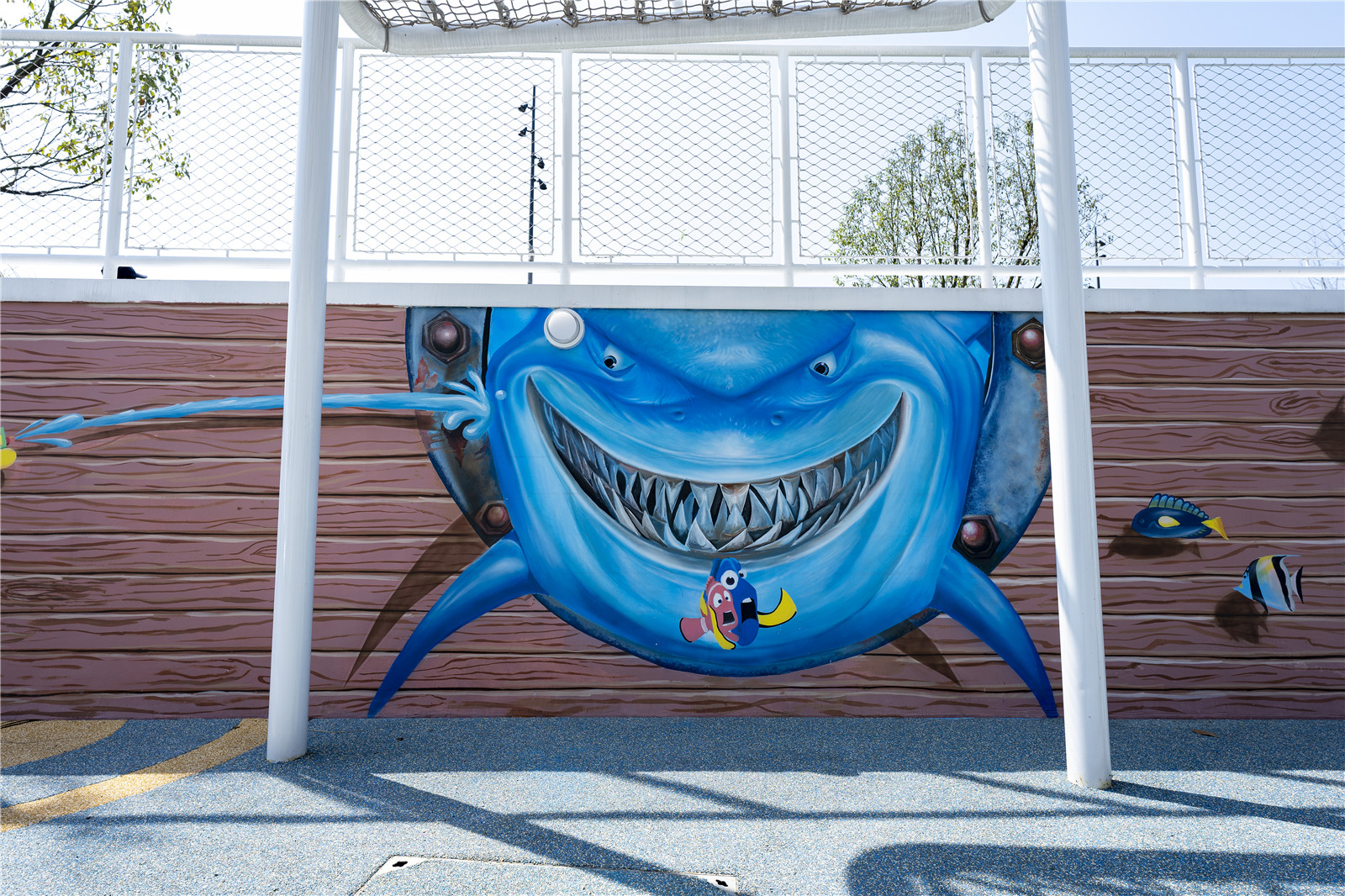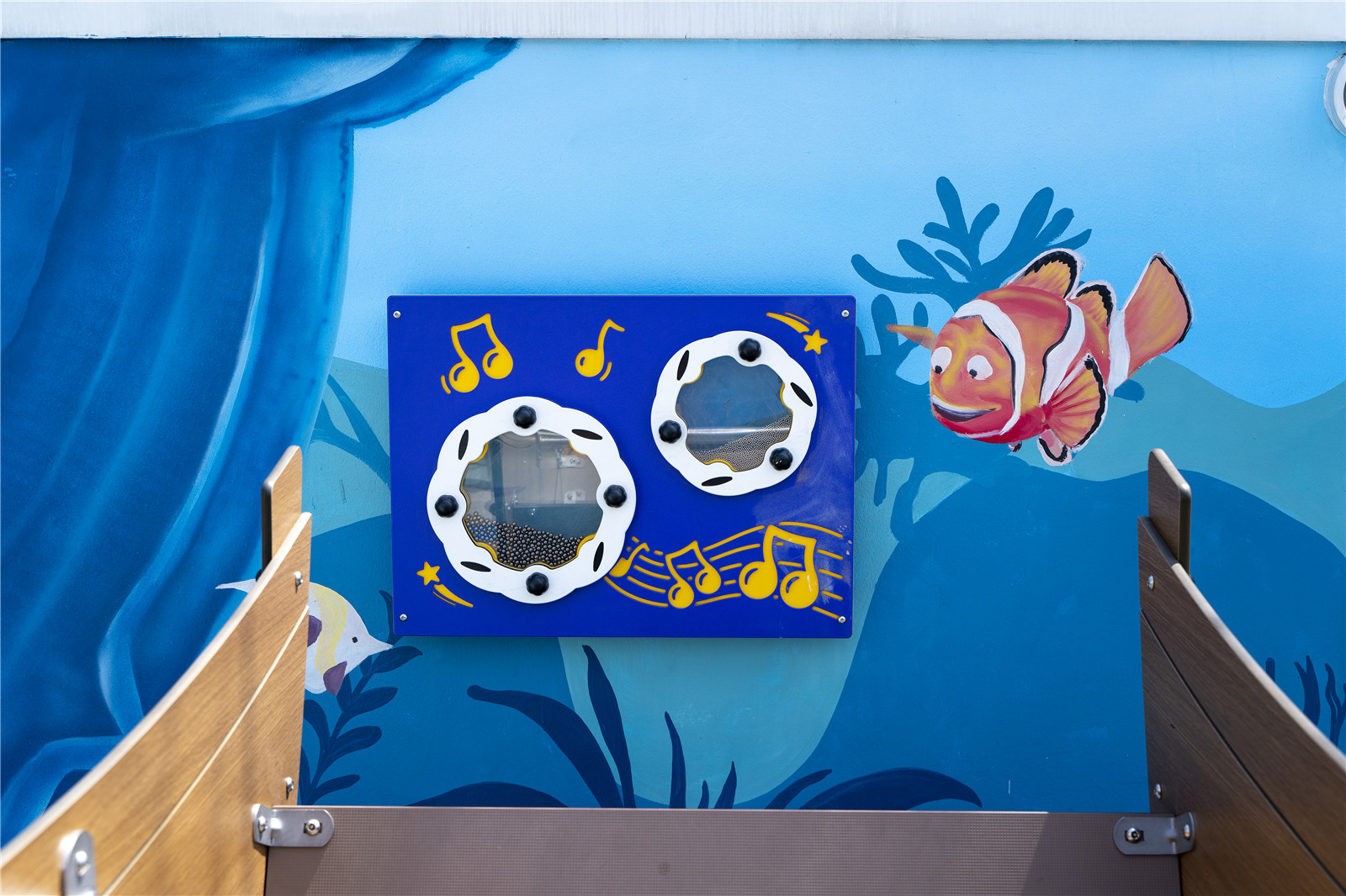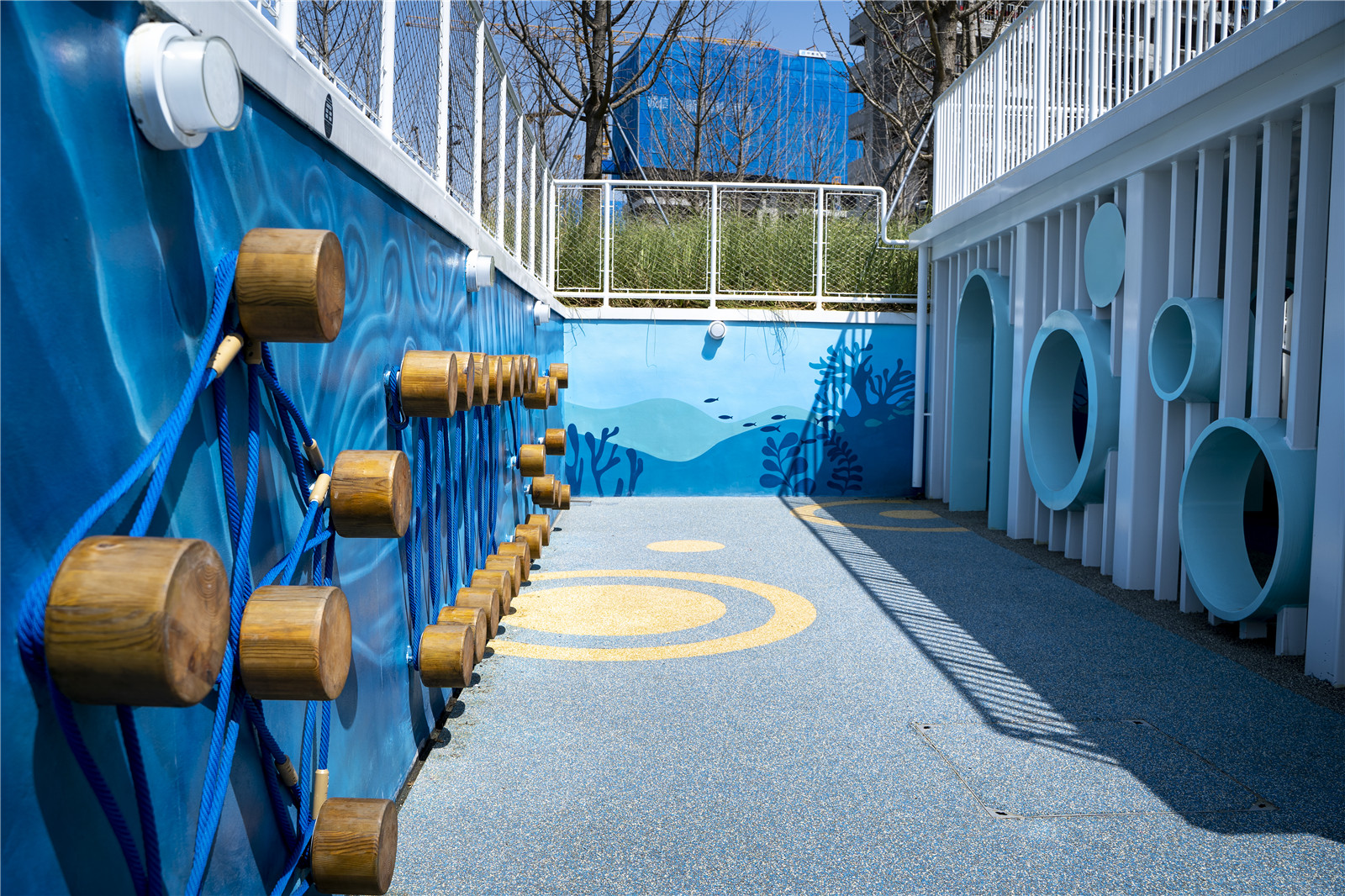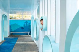 如果說,用一艘軍艦裝下孩子們對大海的敬畏與好奇,那么在船底墻面的設(shè)計,則為孩子們描繪了一個充滿刺激與活力的海底世界。