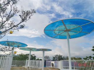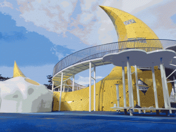 抬頭仰望天空,星辰閃爍,晚風(fēng)輕踩著云朵, 泡泡云依偎著月亮。天真的孩子從七色的彩虹棧道跑來穿過云彩,感受月亮谷的浪漫魔力。