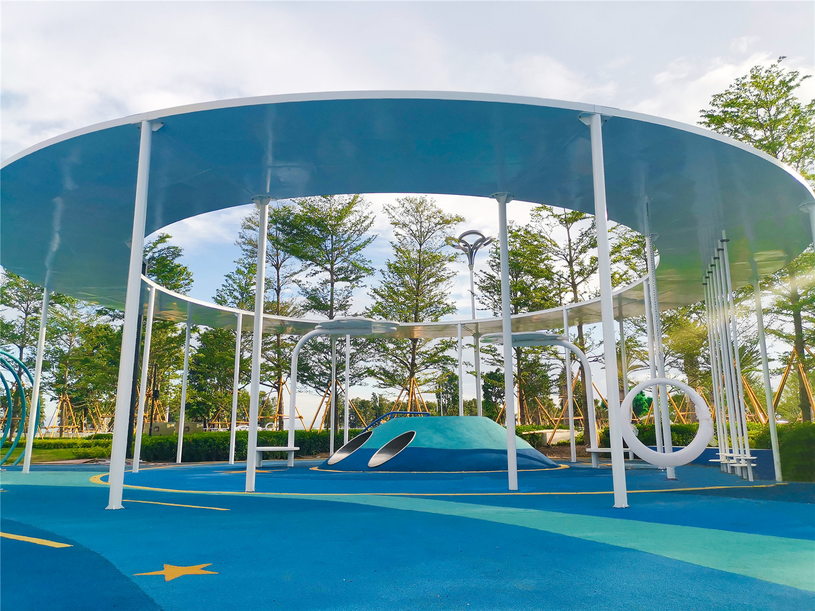 凱奇團隊設(shè)置特色廊架,如云般散落林蔭,與周邊景觀樹木共同給兒童場地帶來一片陰涼,不同顏色、不同形狀,給予設(shè)計更多出彩的可能性。