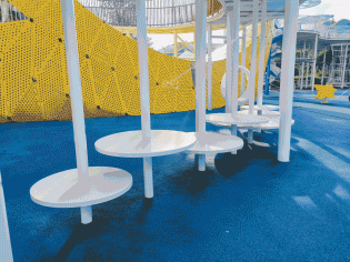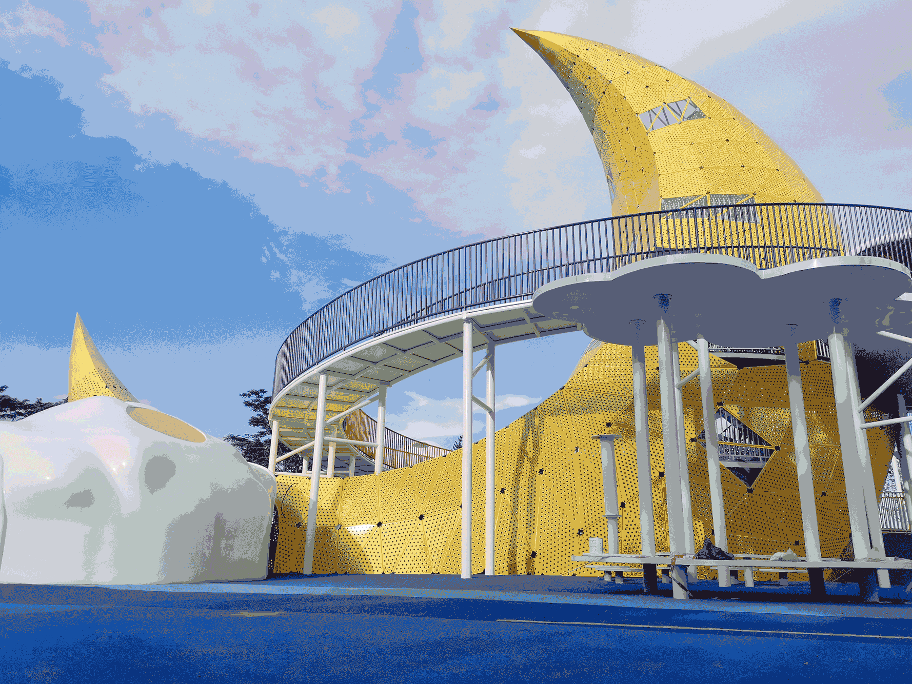 步道蜿蜒綿長,一草一木,營造迥異的視線感,七色彩虹的建筑線條,結(jié)合月亮秋千,完美駕馭了光影的變換,讓孩子行進其間,別有洞天。