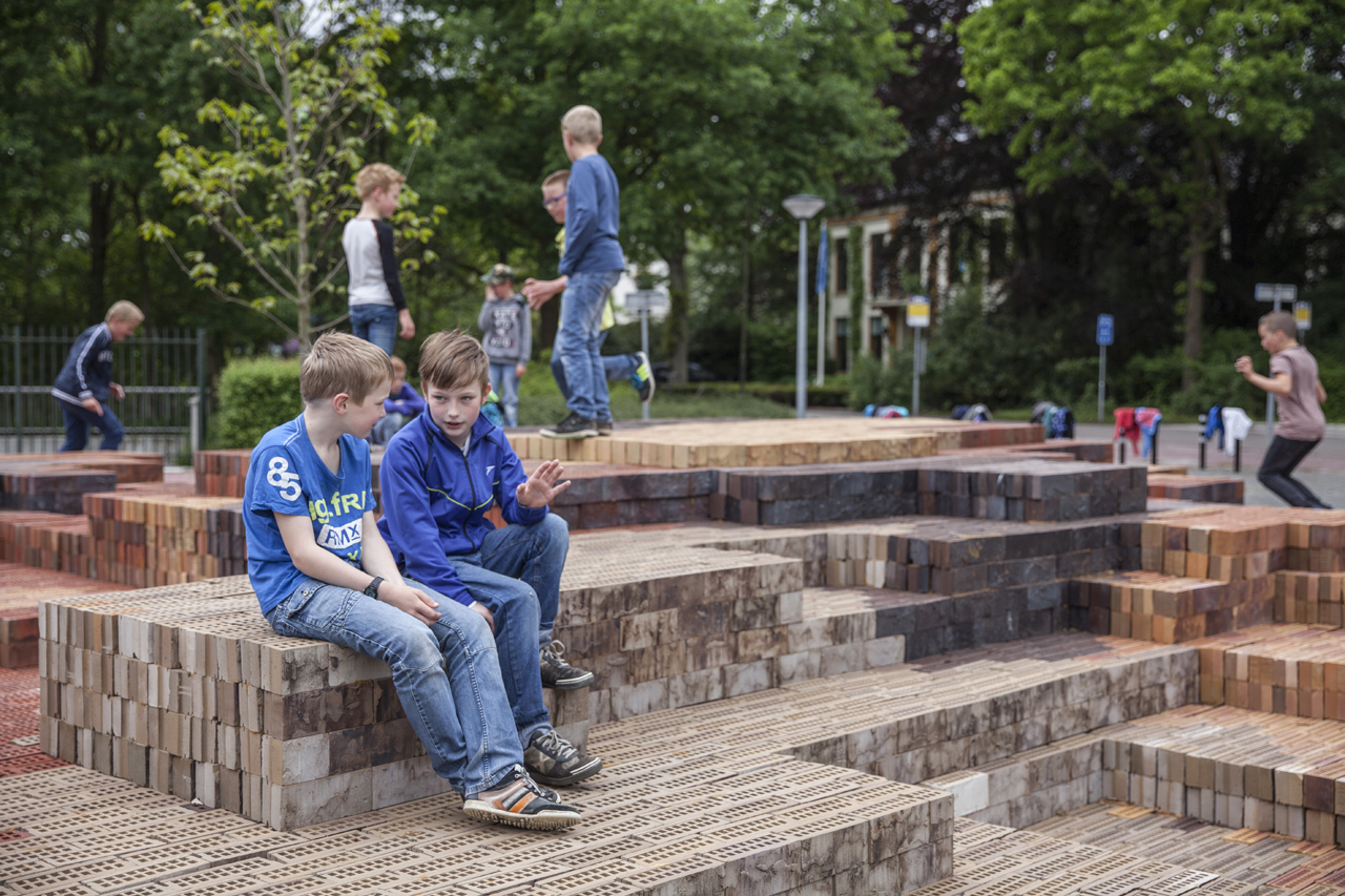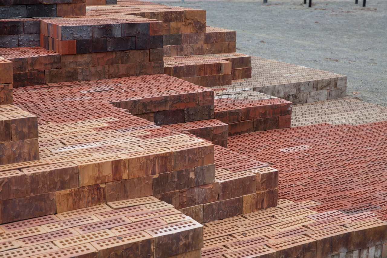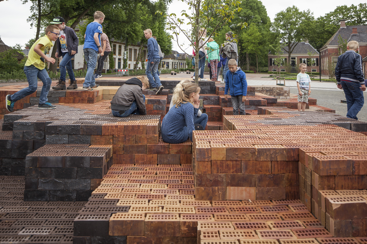 本案成為了村莊中心的遺產(chǎn)廣場(chǎng)上的一處新穎的聚會(huì)場(chǎng)所,裝置圍繞著一棵小樹(shù)形成高低不一的平臺(tái),在不同角度可作為頒獎(jiǎng)臺(tái)、看臺(tái)、游樂(lè)場(chǎng)和展覽空間。3萬(wàn)多塊深淺不一的紋理磚形成了類似自然土壤的迷彩漸變,它們?cè)谛?shù)周圍升高,然后向下形成包圍著樹(shù)干的座椅。
