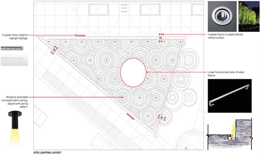 整個(gè)綠地構(gòu)架結(jié)構(gòu)輕盈而簡(jiǎn)練,上面覆蓋著季相變化鮮明的攀緣植物。地面的石材色彩素雅,靠不同的紋理和雕琢,還有前對(duì)比色進(jìn)行區(qū)分。桌椅造型簡(jiǎn)單,存在卻又安靜,仿佛是構(gòu)架的一部分。節(jié)能的照明設(shè)計(jì)力求明亮安全,突出紀(jì)念構(gòu)架本身,營(yíng)造安靜的氛圍。
