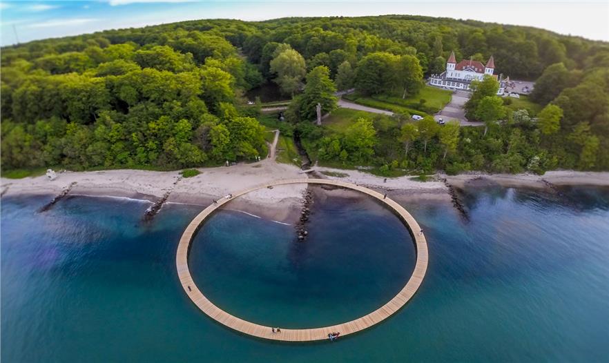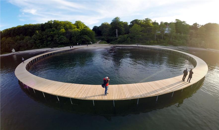 “無盡的橋”是由丹麥建筑師雕塑工作室Gjøde & Povlsgaard為了本次國際雙年展而準備的參展作品,2015的主題為海邊雕塑,舉辦地則在海邊雕塑風景優(yōu)美的海濱城市奧爾胡思周圍。“無盡的橋”直徑60米,其建筑整體一半在海灘上,一半在海里。它由60米相同的木料結(jié)合鋼柱來安置,海平面下的深度大約為2米。橋的甲板會根據(jù)抄襲的變化,將會離開海面1到2米的距離。橋的曲率是景觀的輪廓,正因為它坐落在一個小的口河谷延伸到森林里的海灘。出了相當開闊的海濱全景,“無盡之橋”還連接起了現(xiàn)在與歷史的聯(lián)系,它使人們想起了已經(jīng)被忘卻的那些美麗景色。Gjøde & Povlsgaard建筑事務(wù)所的合伙人及聯(lián)合創(chuàng)始人Niels Povlsgaard說道,“該橋梁位于當?shù)厝藗冊恢弊羝珊蛹胺潘傻拇a頭。瓦爾納歷史館,坐落在海灘上方的山坡上,是當?shù)氐囊粋€受歡迎的景區(qū),上面有著景觀露臺,餐館和舞廳。坐落在森林的邊緣面對大海的場館館是有著相當年歲的船塢碼頭,已不復存在。“無盡的橋”這一歷史性的連接,為這里提供了一個新的視角,使得這里能夠重新連接起城市和周圍景觀之間的聯(lián)系。
