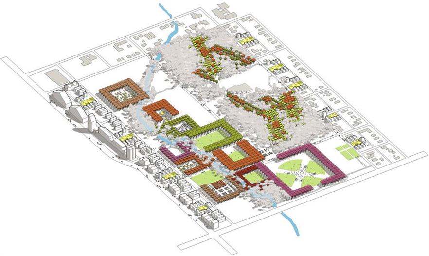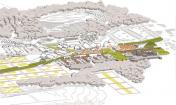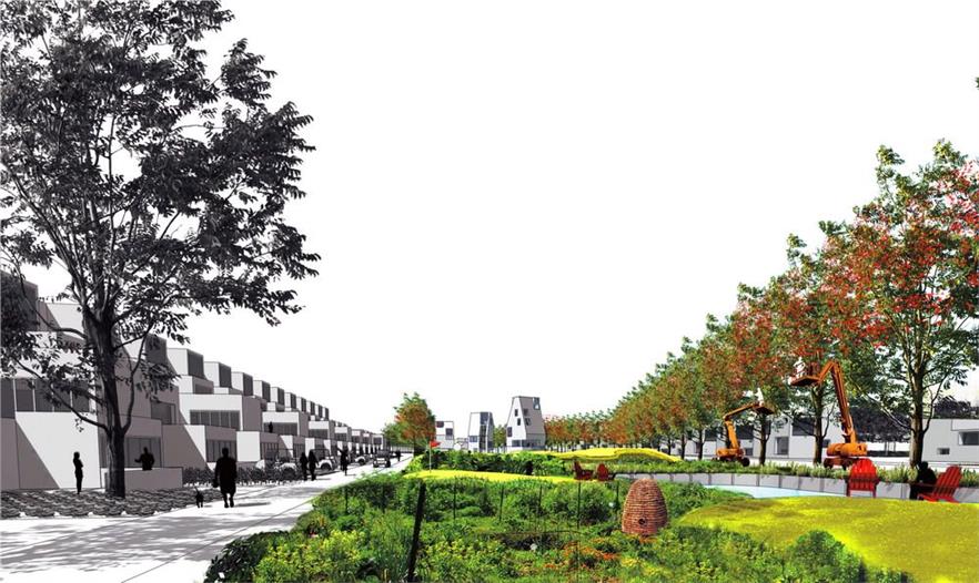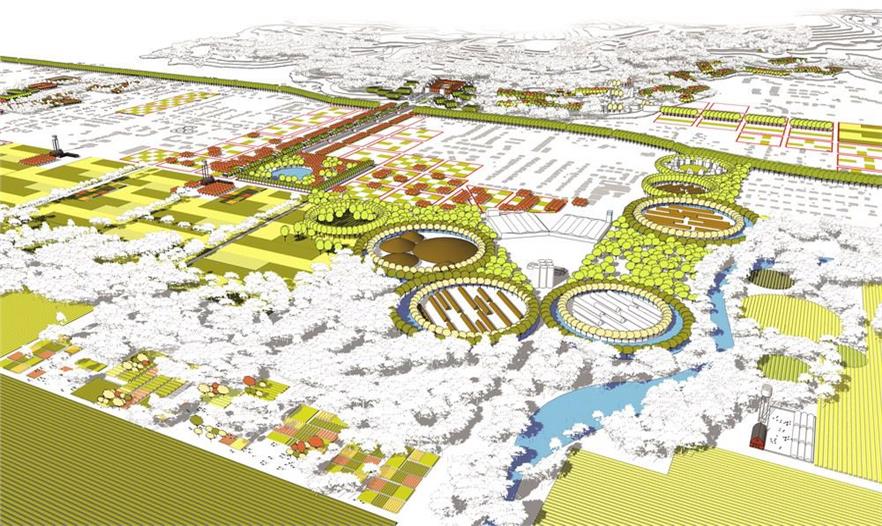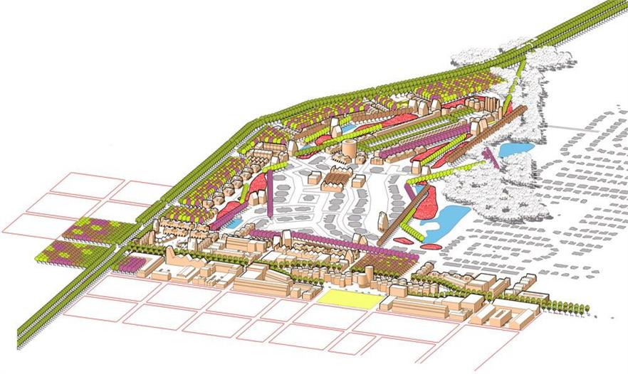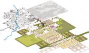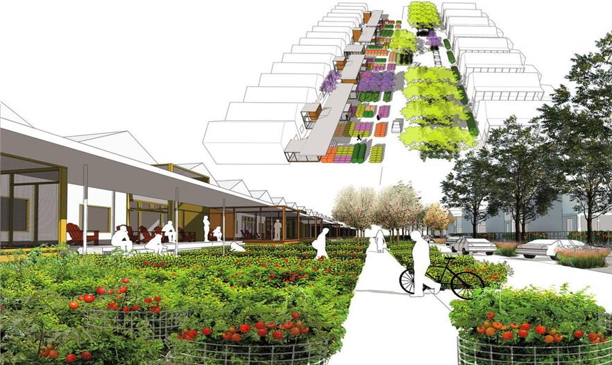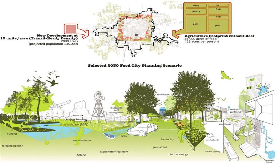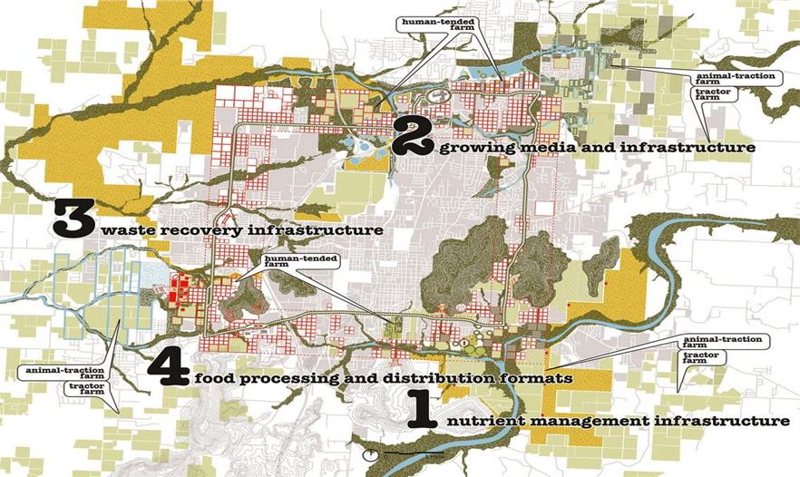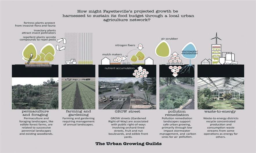 食品之城介紹了四種基礎(chǔ)設(shè)施的形式,分別是養(yǎng)分管理設(shè)施、有機(jī)基質(zhì)、廢物回收設(shè)施和食品的處理分配,并為整體食物體系的重新設(shè)定構(gòu)想必需的設(shè)計(jì)語(yǔ)言。此外,食品之城還根據(jù)定位功能制定了5條指導(dǎo)城市種植的農(nóng)業(yè)生態(tài)學(xué):(1)永久性培養(yǎng)/食品景觀,與現(xiàn)有林地為主的常年景觀;(2)每年培植的密集型農(nóng)場(chǎng)和園藝景觀;(3)種植型街道(道路兩邊的園藝),如街道果園和種有可食作物的前院;(4)污染修復(fù)景觀,保證城市的安全養(yǎng)殖;(5)廢品集中的廢物區(qū)。規(guī)劃策略運(yùn)用了連續(xù)性的城市主義,來(lái)發(fā)展城鎮(zhèn)和鄉(xiāng)村的重組形式,以綠化帶為開(kāi)端,從而加強(qiáng)農(nóng)業(yè)體系和費(fèi)耶特維爾零星環(huán)形公路景觀沿線的城市密度。此外,食品之城還設(shè)計(jì)了一系列的城市農(nóng)業(yè)房地產(chǎn)產(chǎn)品,為華爾街金融化的19類主流資產(chǎn)創(chuàng)造附加價(jià)值。然而密集的大都市人均產(chǎn)生大量的碳足跡,小城市則由于自然生態(tài)系統(tǒng)、基礎(chǔ)設(shè)施和城市組織的互聯(lián)性,能夠保證富有彈性的食品安全環(huán)境。